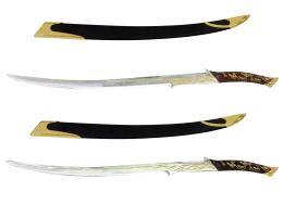 • Lot n° 141 PAREJA DE SABLES Pareja de sables grandes. Empuñadura en madera con motivos vegetales y remates en metal dorado. Hoja realizada en acero inoxidable con decoración en dorado, de 75cm. Se acompaña de funda dura forrada de piel fina con remates en metal dorado. Una de las fundas presenta pequeños desgarros Longitud total: 97cm