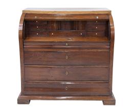 • Lot n° 178 MUEBLE SECRETER ESTILO BIEDERMEIER EN MADERA DE ROBLE, FF S.XIX Austero mueble realizado en madera con bocallaves en metal dorado. Tapa superior abatible, en cuyo interior guarda nueve cajones de diversos tamaños, junto con un compartimento central con cerradura. Cuerpo inferior conformado por tres grandes cajones. Con tres tipos de llaves. 114x123x60 cm.