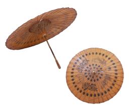 SOMBRILLA DE BAMBÚ, PAPEL Y ACEITE. CHINA, PPCIOS. S.XX  Cubierta realizada en papel y aceite para evitar que se seque. Decorada con caracteres y motivos vegetales y animales realizados a mano en color negro. Estructura realizada en bambú. Muestra desperfectos en la cubierta.
