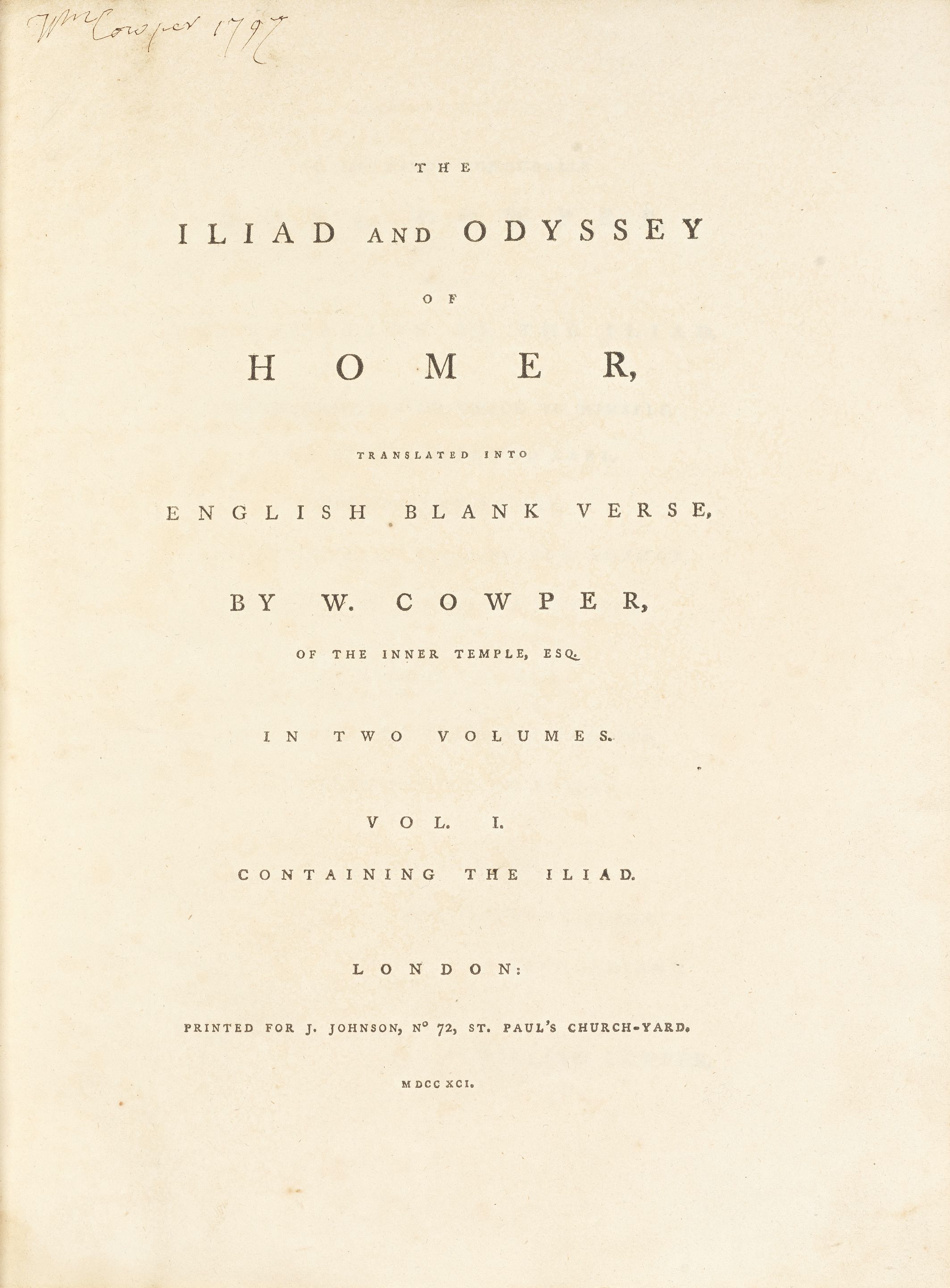 COWPER (WILLIAM, translator) HOMER. The Iliad and Odyssey... Translated into English Blank Verse, by W. Cowper, 2 vol., COWPER'S OWN COPY, J. Johnson, 1791