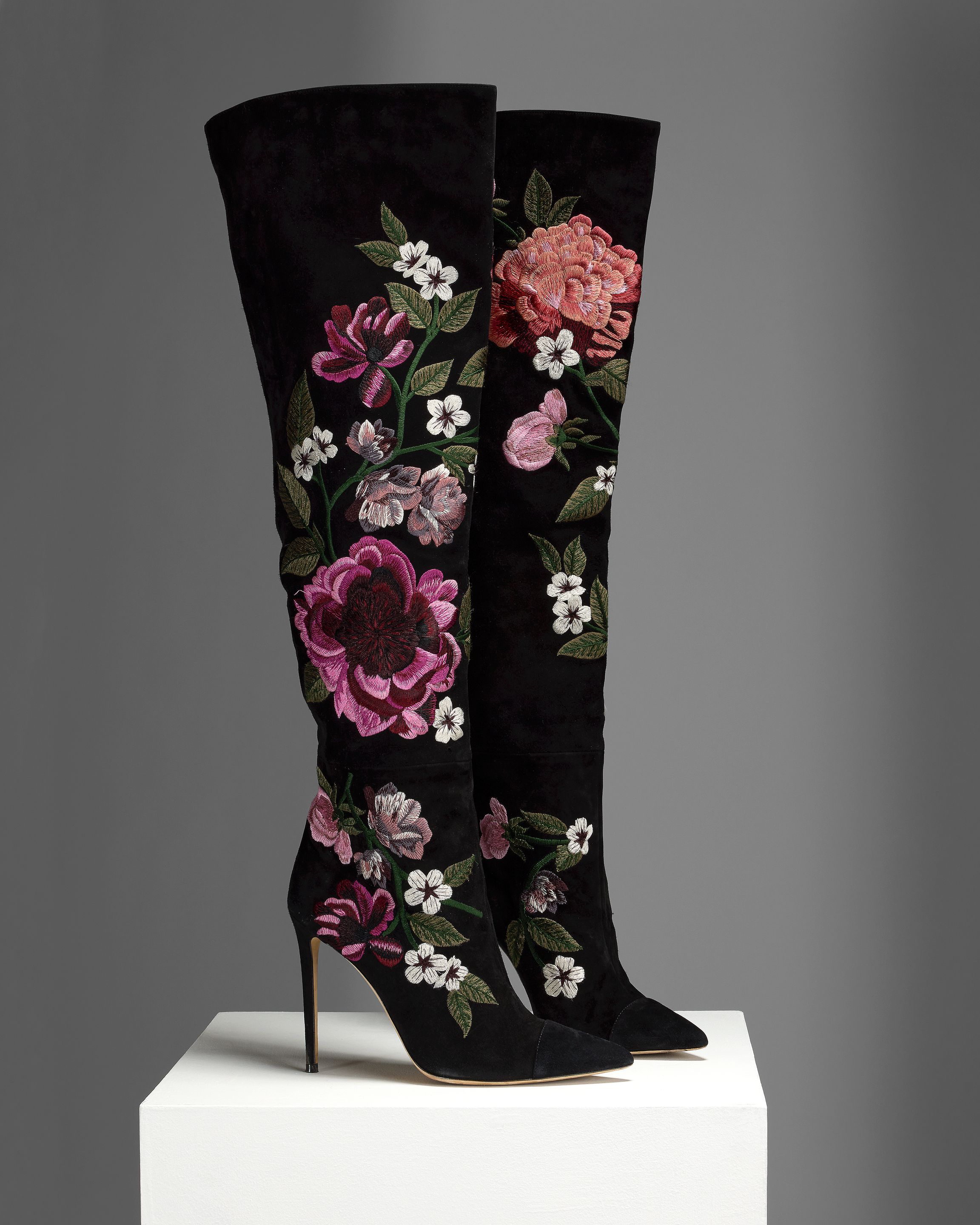 Ralph & Russo Sample: Black Embroidered Suede Over-the-Knee Heeled Boots (includes dust bags)