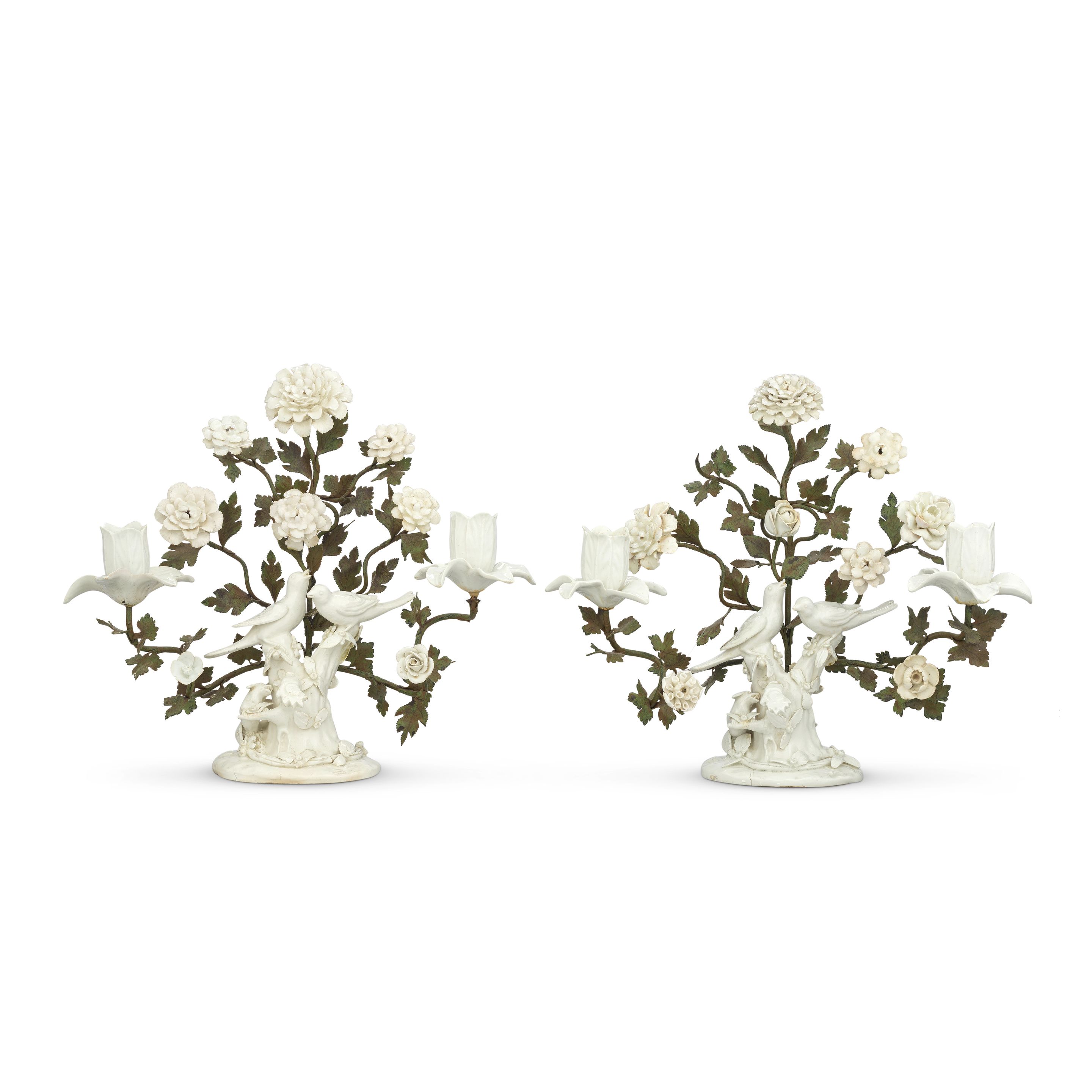A fine pair of Derby white 'Birds in Branches' candelabra, circa 1750-55 Dim 32 x 38,5 x32 cm