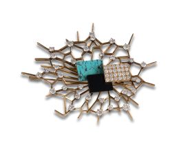Broche de moderno diseño, años 70, en oro amarillo de 18 kt. con placa de turquesa, de ónix y diamantes, talla brillante, con un peso total estimado de 6.50 ct. Presenta numeración 11539. Peso: 48,90 Gr. .