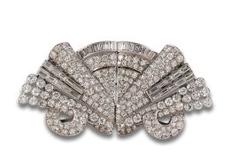 Broche doble-clip de estilo Chevalier en platino con diamantes, talla brillante y baguette, con un peso total aproximado de 18.00 ct. engastados en chatón, en grano y a bisel.