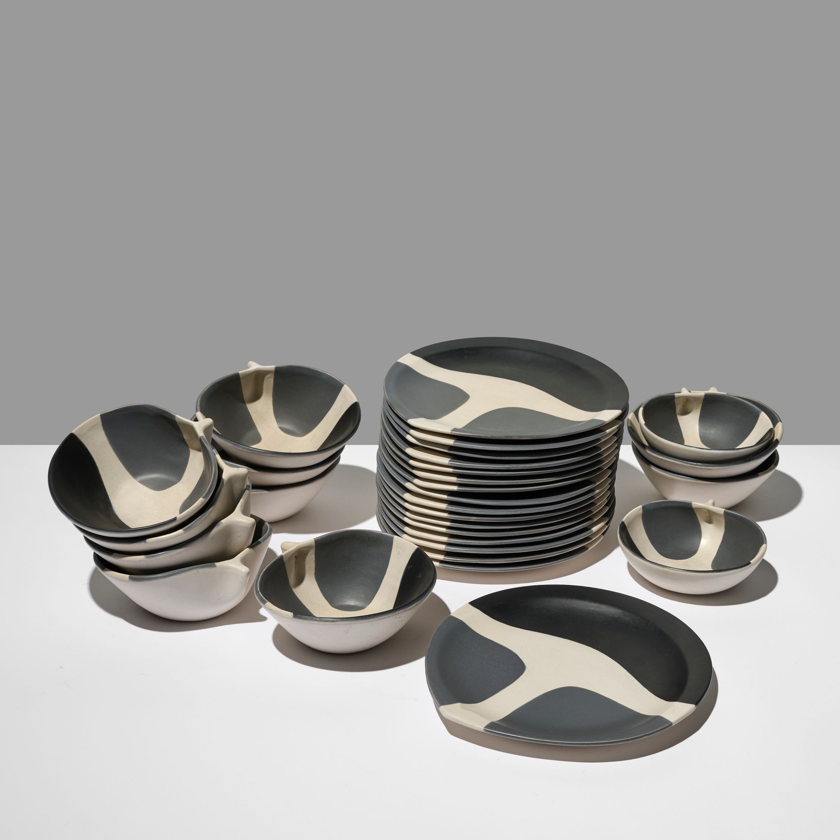 • Lot n° 64 MADO JOLAIN (1921-2019) Partie de service de table, 29 pièces Comprenant 17 assiettes, 10 coupes et 2 coupelles Circa 1955 Chacune monogrammée 'MJ' Céramique Chaque assiette : L: 27,5 cm. (10.3/4 in.); P: 26 cm. (10.1/4 in.) Part of a monogrammed dining set, 29 monogrammed pieces, comprising 17 plates, 10 coupes and 2 small coupes in glazed ceramic by Mado Jolain circa 1955.