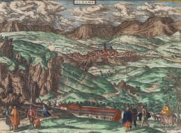 • Lot n° 534 GEORGIUS HOEFNAGEL Amberes, Bélgica (1542) / Viena, Austria (1600) "Alhama, Granada", 1564 Grabado iluminado a mano Firmado y fechado en la parte inferior. Presenta deterioros en el papel Al dorso historia de Alhama (impresión), inicial decorada. Medidas: Huella: 34 x 46 cm