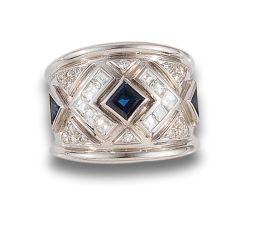 Ancha sortija en oro blanco de 18 kt. con zafiros calibrados y diamantes, talla brillante y carré.