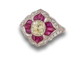 Sortija estilo Art Déco en platino con diamante central old mine estimado en 1.20 ct. orlado por rubíes calibrados en talla trapecio y friso de brillantes.