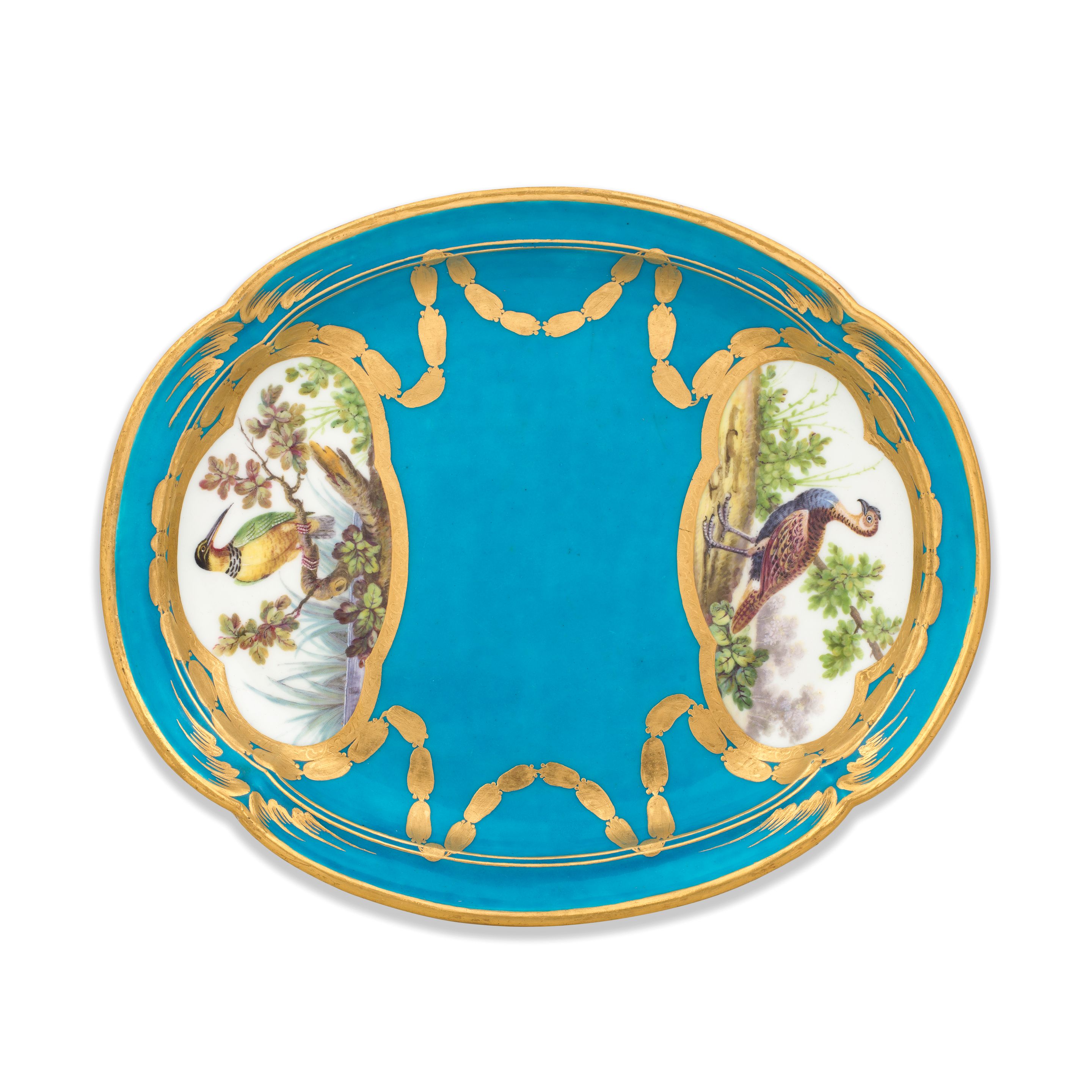 • Lot n° 94 A Sèvres bleu-céleste ground ornithological stand probably from the service for Nikolai Chotinski, dated 1768 A Sèvres bleu-céleste ground ornithological stand probably from the service for Nikolai Chotinski, dated 1768 Reserved with two gilt-edged oval panels painted by François-Joseph Aloncle each with a scene depicting a bird in a landscape surrounded by gilt flower or husk swags, titled on the underside in black: ' Martin pecheur/de cayenne ' and ' faisau dindou de/la Chine(?) ', 23.8cm across, interlaced LL monogram enclosing date letter P and painter's mark N for Aloncle (very minor surface wear) Footnotes Provenance: From the service made in 1768 and 1769, probably for Nikolai Konstantinovich Chotinski, Russian chargé d'affaires to France from 24 December 1767 to January 1774, and subsequently from 1780 to 1782. For a discussion of the service and its components, see David Peters, Sèvres Plates and Services of the 18th Century, 2005, revised edition 2015, II, pp. 411-412, no. 69-2.