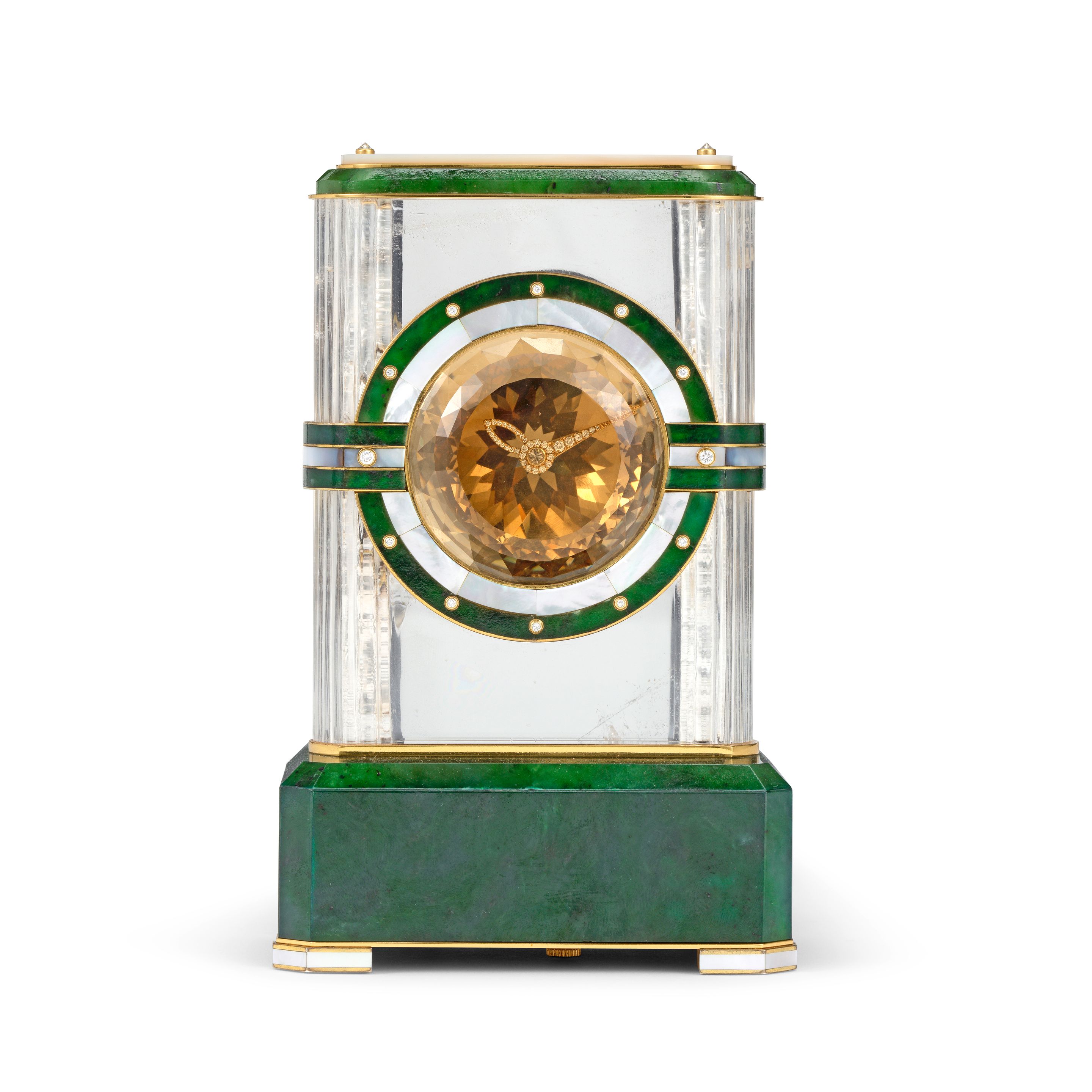 • Lot n° 58 A fine and rare late 20th century diamond-set, rock crystal, mother of pearl and nephrite mystery clock Imhof, the quartz movement numbered 99400268. The rear Opera No 3/5 Dim 8 x 11 x17 Dim 8 x 11 x17 cm