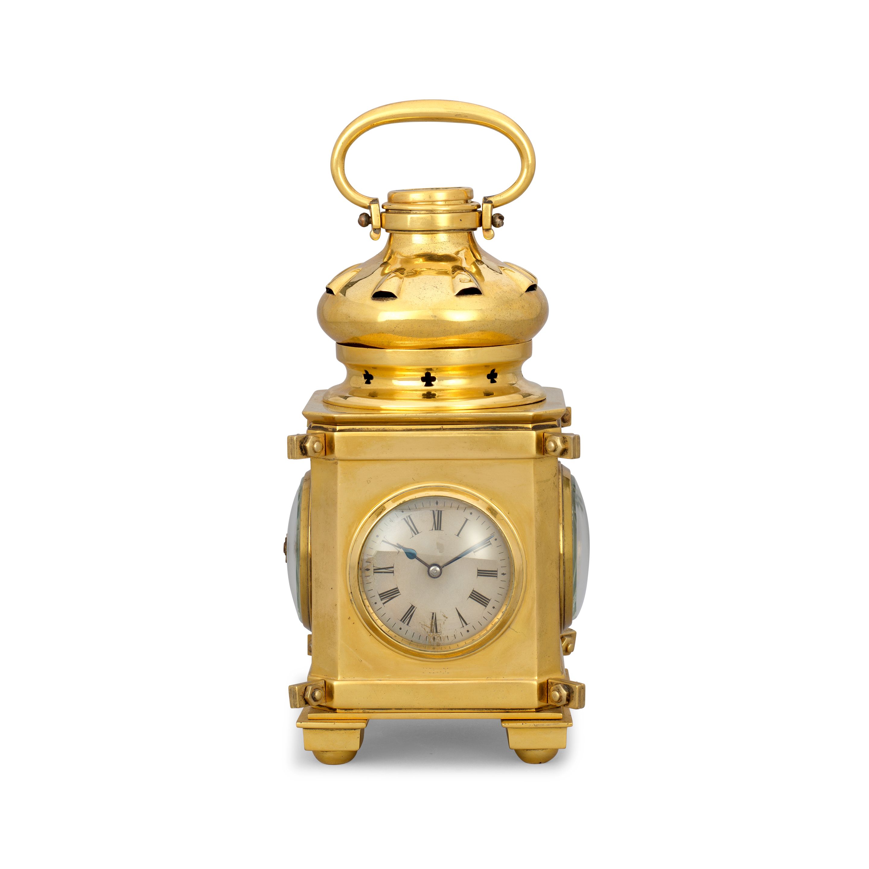 • Lot n° 22 A late 19th century French compendium carriage clock in the form of a lantern Dim 4,5 x 4,5 x10 Dim 4,5 x 4,5 x10 cm