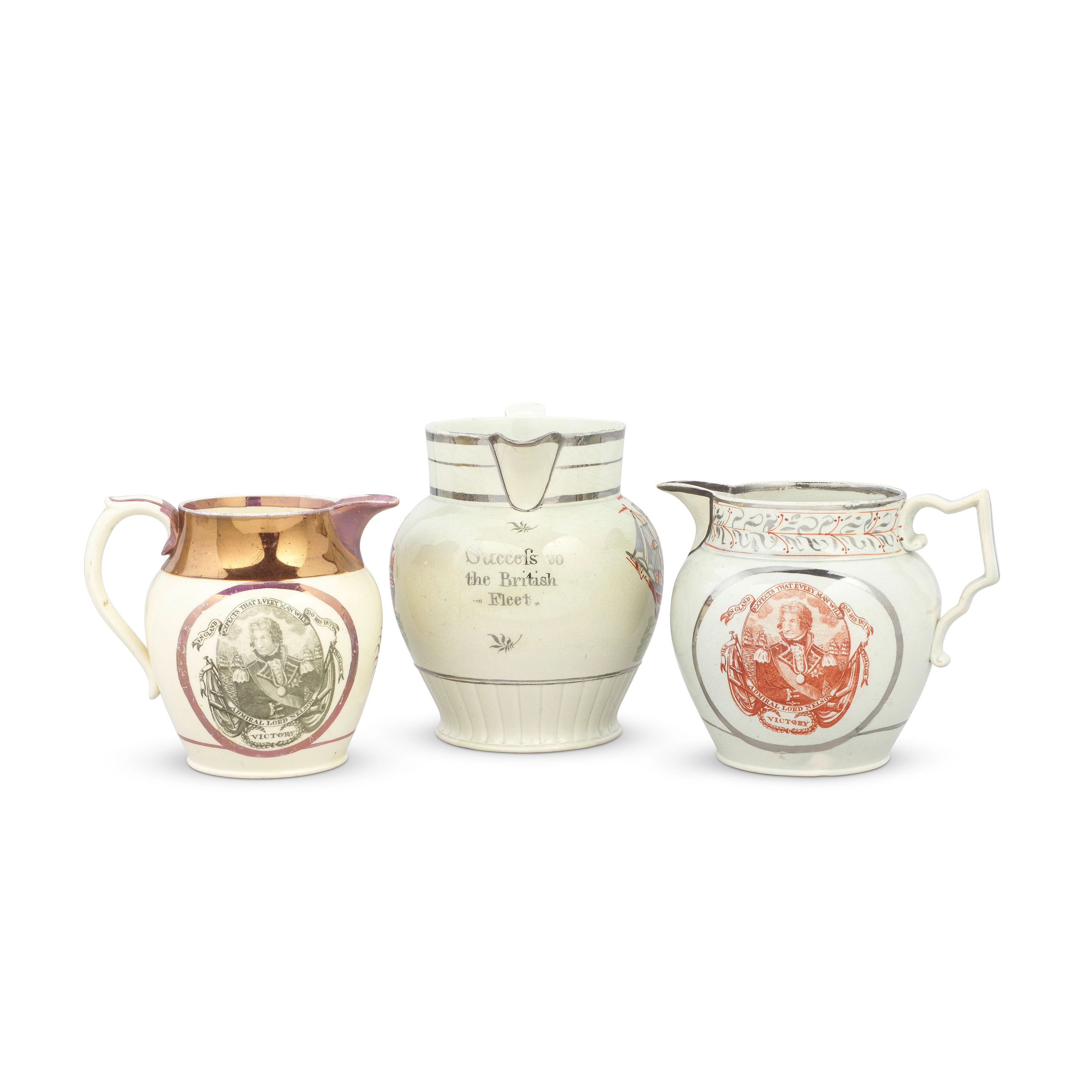 • Lot n° 9 Three lustre jugs, early 19th century A pearlware example with gadrooned foot, painted in silver lustre, red and green enamel with two fine warships, inscribed below the spout 'Success to the British Fleet', 16.8cm high, the two smaller jugs printed on both sides in black or red with portraits of Nelson commemorating his victories, highlighted in silver, pink and copper, 13.5cm and 14cm high (3)