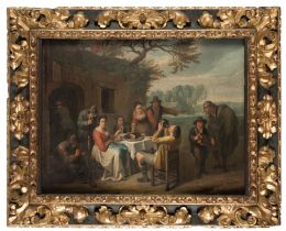 ESCUELA ITALIANA, POSIBLEMENTE BOLOÑESA (S. XVIII) "Aldeanos cocinando y jugando a las cartas" y "Aldeanos comiendo y escuchando música" Pareja de óleos sobre lienzo. Se presentan con importantes marcos barrocos en madera policromada y dorada. Medidas: 60 x 80 cm.