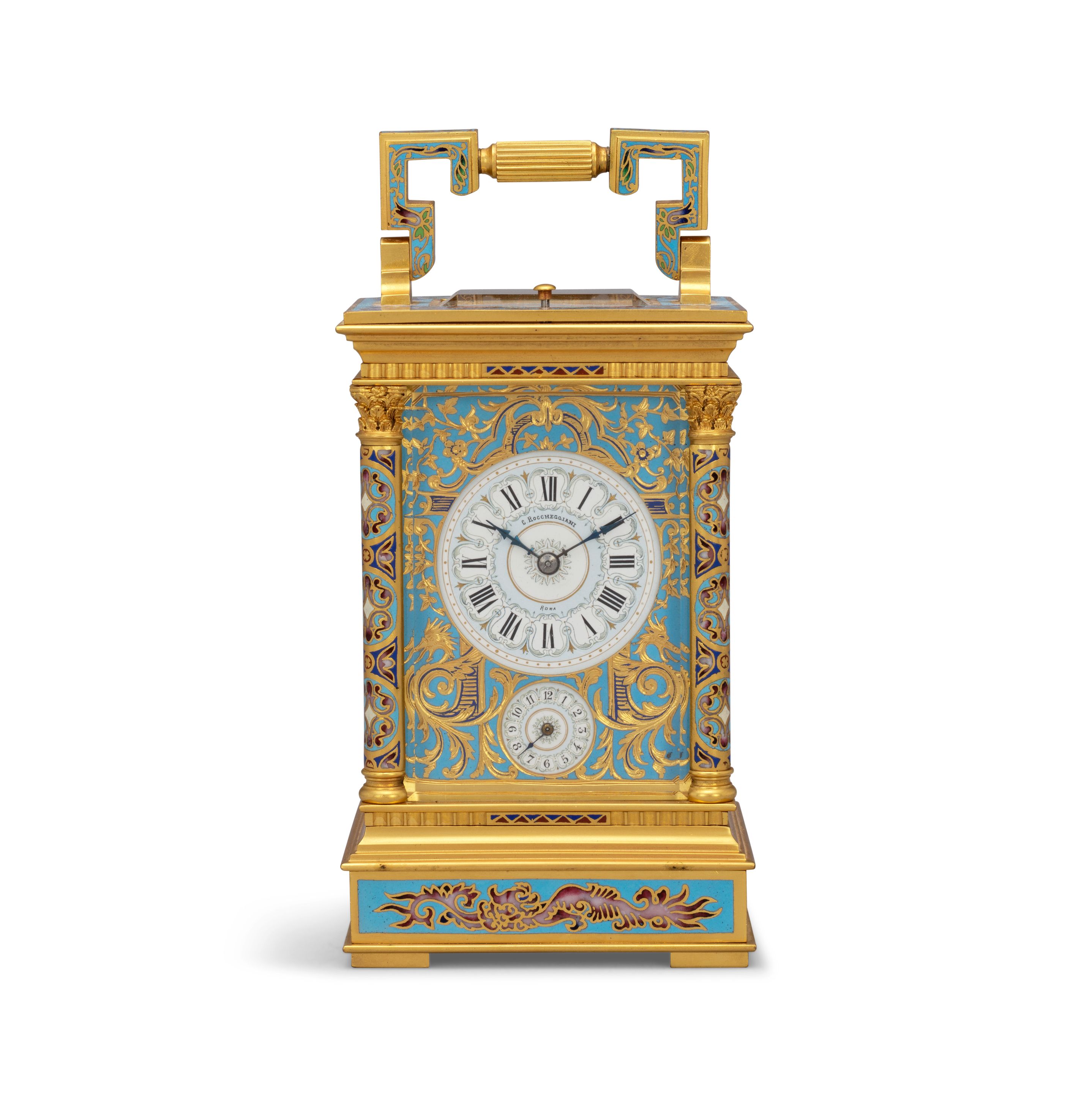 A fine late 19th century French champleve enamel decorated, grande sonnerie carriage clock with alarm Retailed by Cesare Roccheggiani, Rome Dim 3,5 x 4 x8 Dim 3,5 x 4 x8 cm
