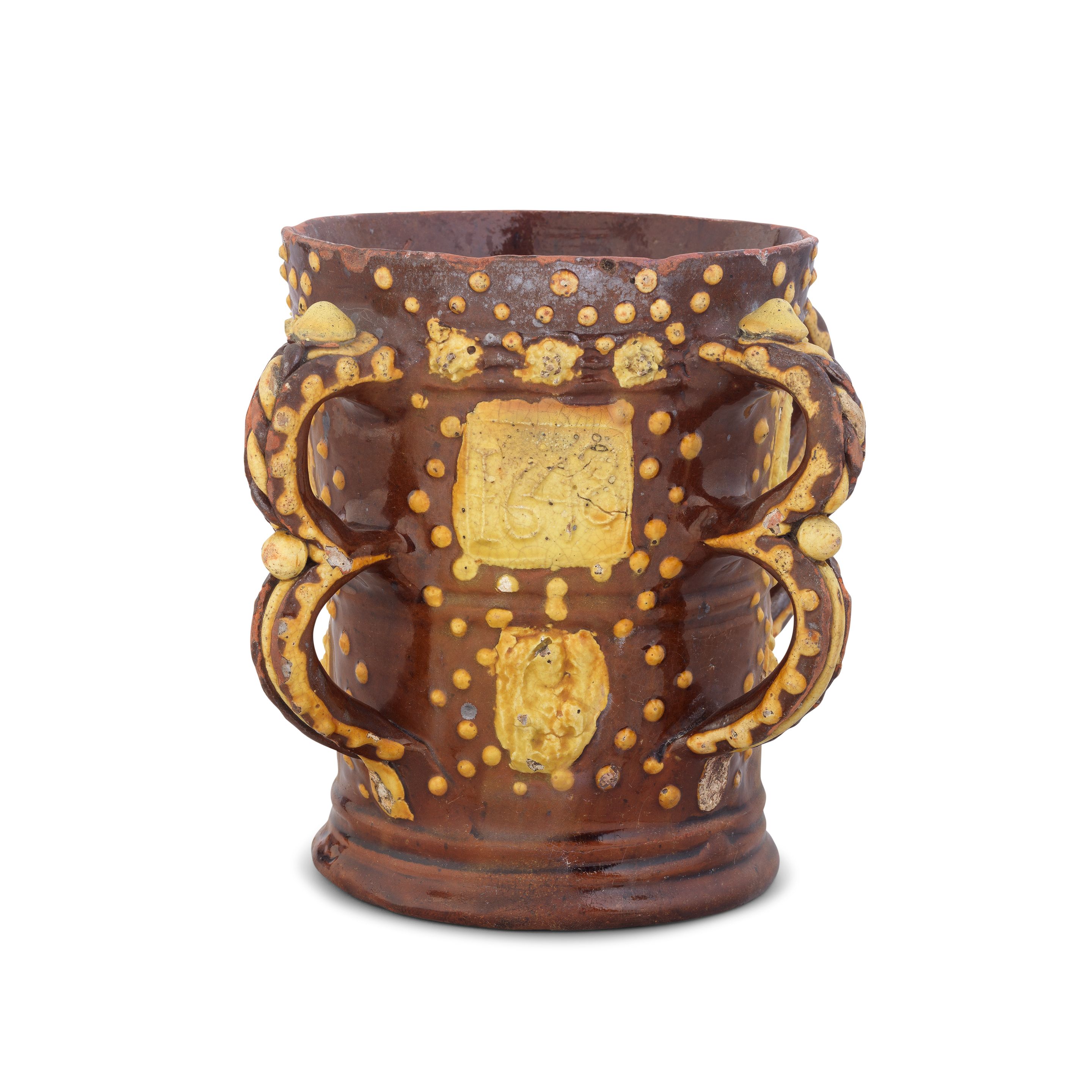 • Lot n° 11 A Wrotham slipware tyg by George Richardson, dated 1648 Dim 15 x 15 x15,7 cm
