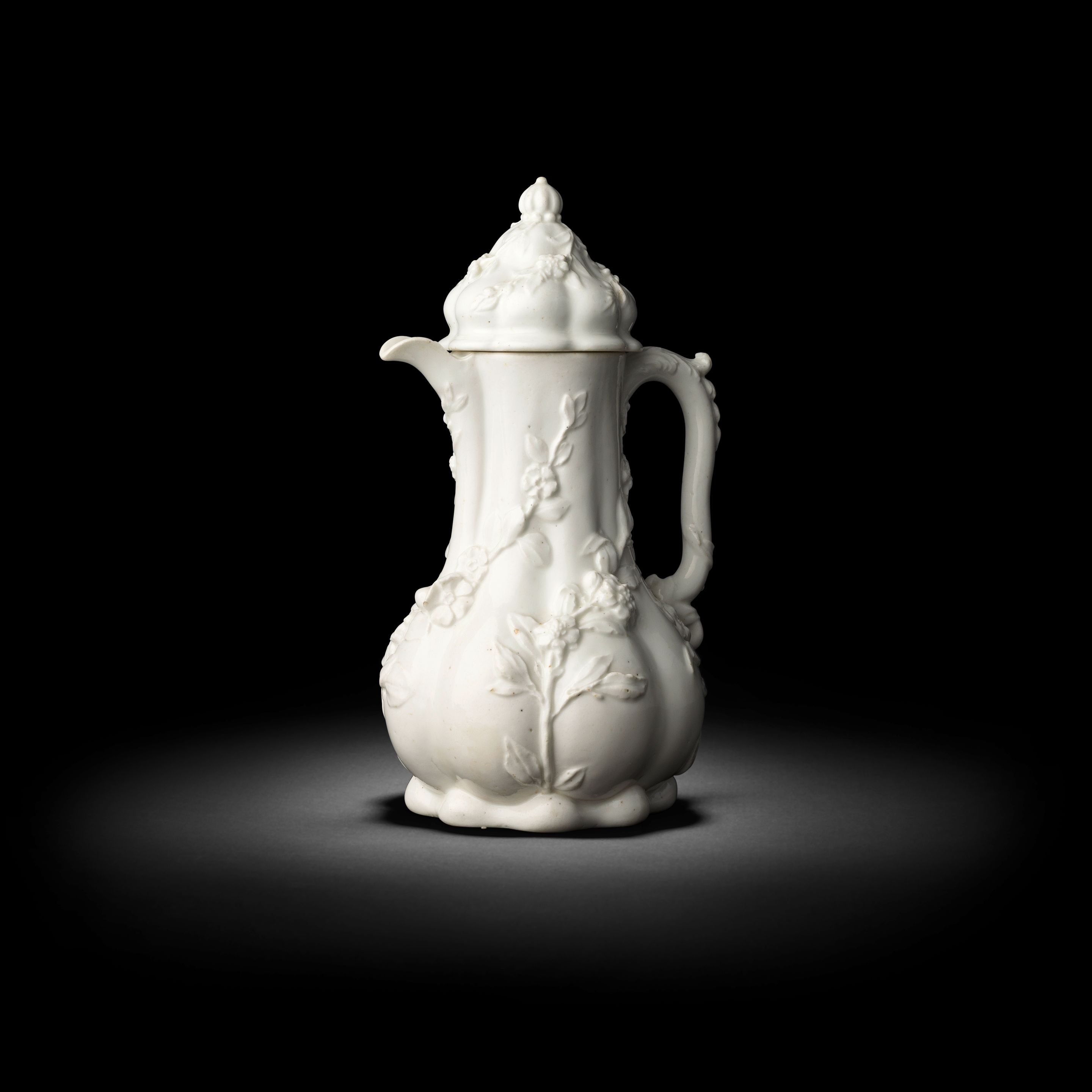 • Lot n° 174 A fine and early Chelsea white 'teaplant' coffee pot and cover, circa 1745-49 Dim 13 x 14 x23 cm
