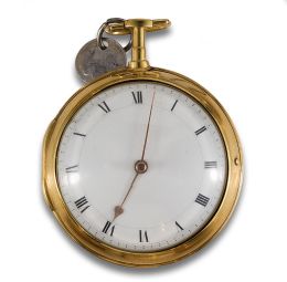 Reloj lepine JOHN GRANT, LONDON, con doble caja de oro amarillo de 18k, sistema de cuerda a llave. Tapas y bisel con decoración lisa. Esfera de porcelana blanca con numeración romana en negro y agujas doradas tipo pica/breguet. Ca. s.XIX. Peso: 127 g.