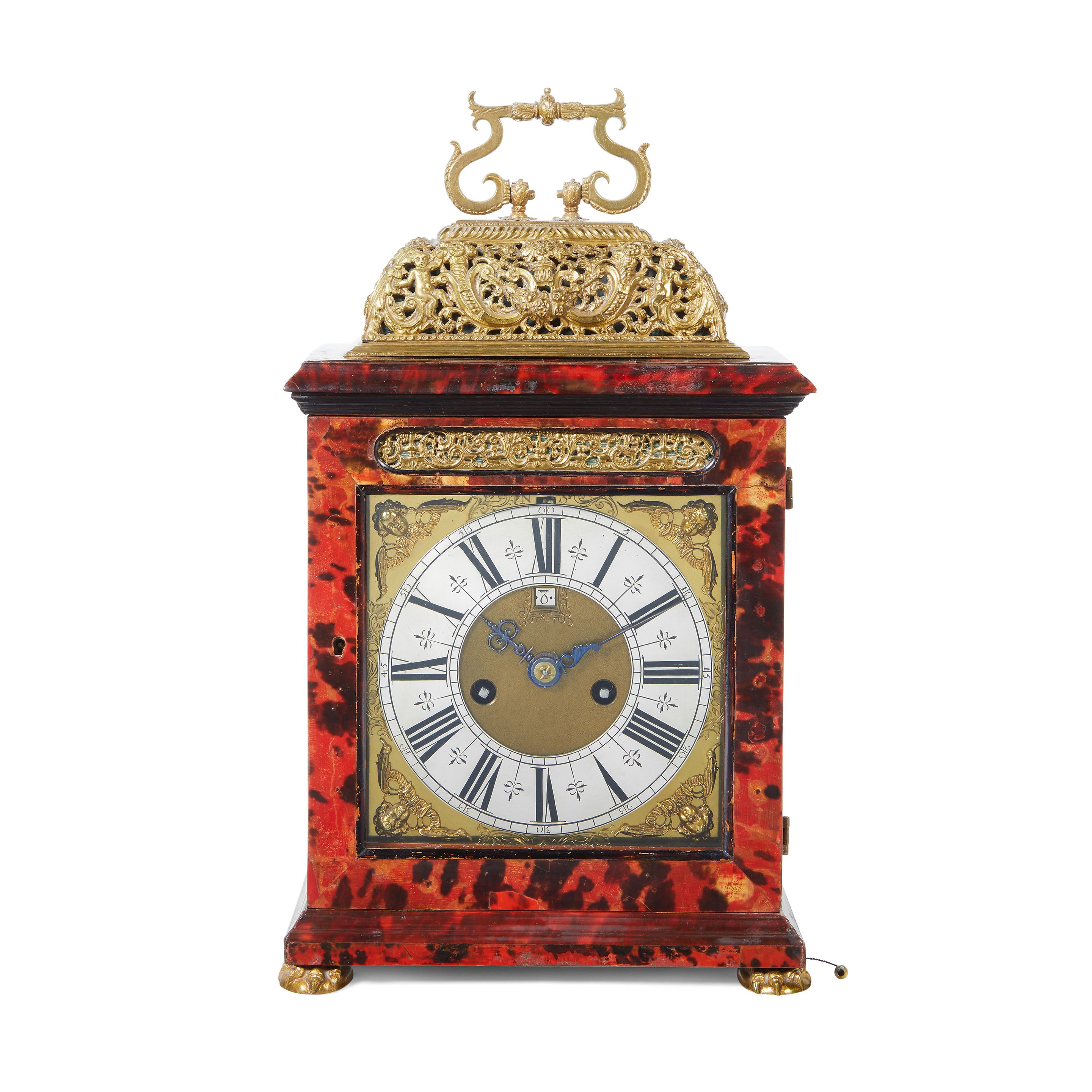• Lot n° 89 A good late 17th century red tortoiseshell basket top quarter repeating table clock Fromanteel Dim 6 x 9,5 x16 Dim 6 x 9,5 x16 cm