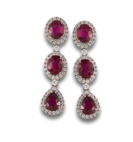 • Lot n° 1319 Pendientes rosetones de oro blanco de 18 kt. Formados por centros de rubíes, talla oval, peso total estimado de 15 ct. orlados de diamantes, talla brillante, peso total estimado de 2 ct.