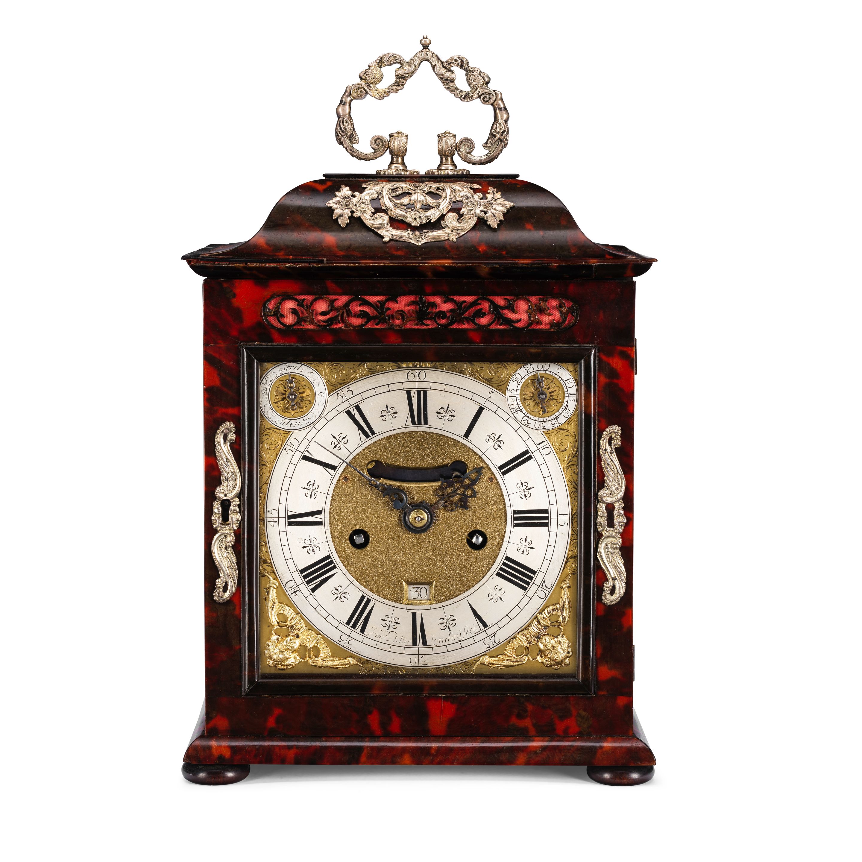 A fine and rare late 17th century silver-mounted tortoiseshell veneered striking and quarter repeating table clock of small size Jonathan Puller, London Dim 6 x 9 x14,5 Dim 6 x 9 x14,5 cm