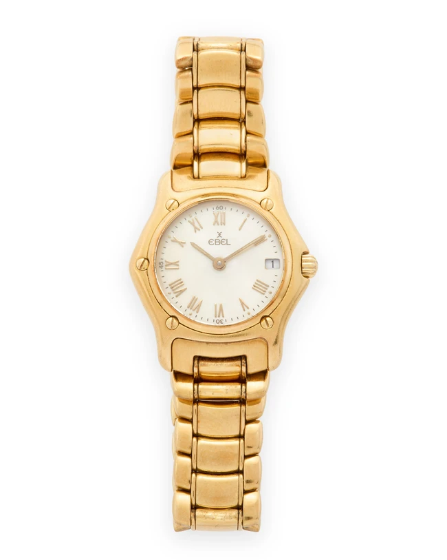 • Lot n° 658 Ebel. An 18ct gold quartz calendar bracelet watch with mother-of-pearl dial 1911, Circa 2000