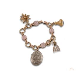 Pulsera de eslabones barbados de oro bicolor con cabujones alternos de cuarzo rosa. Un colante en formal de mina de oro con cabujones de piedras preciosas ; un colgante-dije de oro; un colgante incompleto de oriental, y un colgante portar retratos de plata. Peso: 35 g.