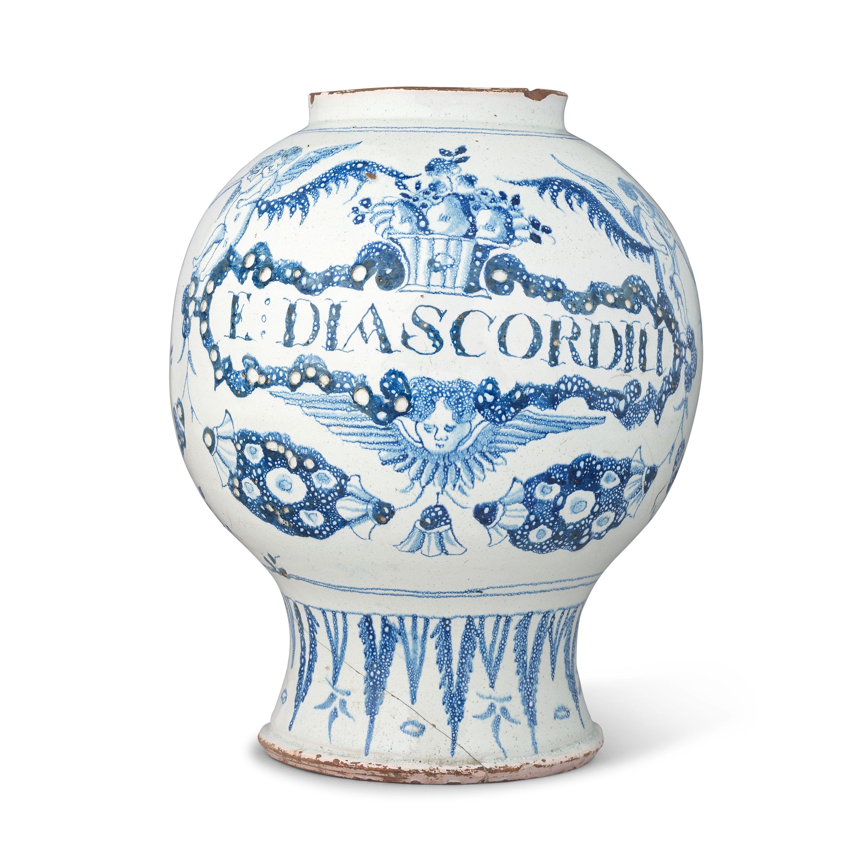 A massive London delftware drug jar, circa 1730-40 dimensions 26x26x31cm