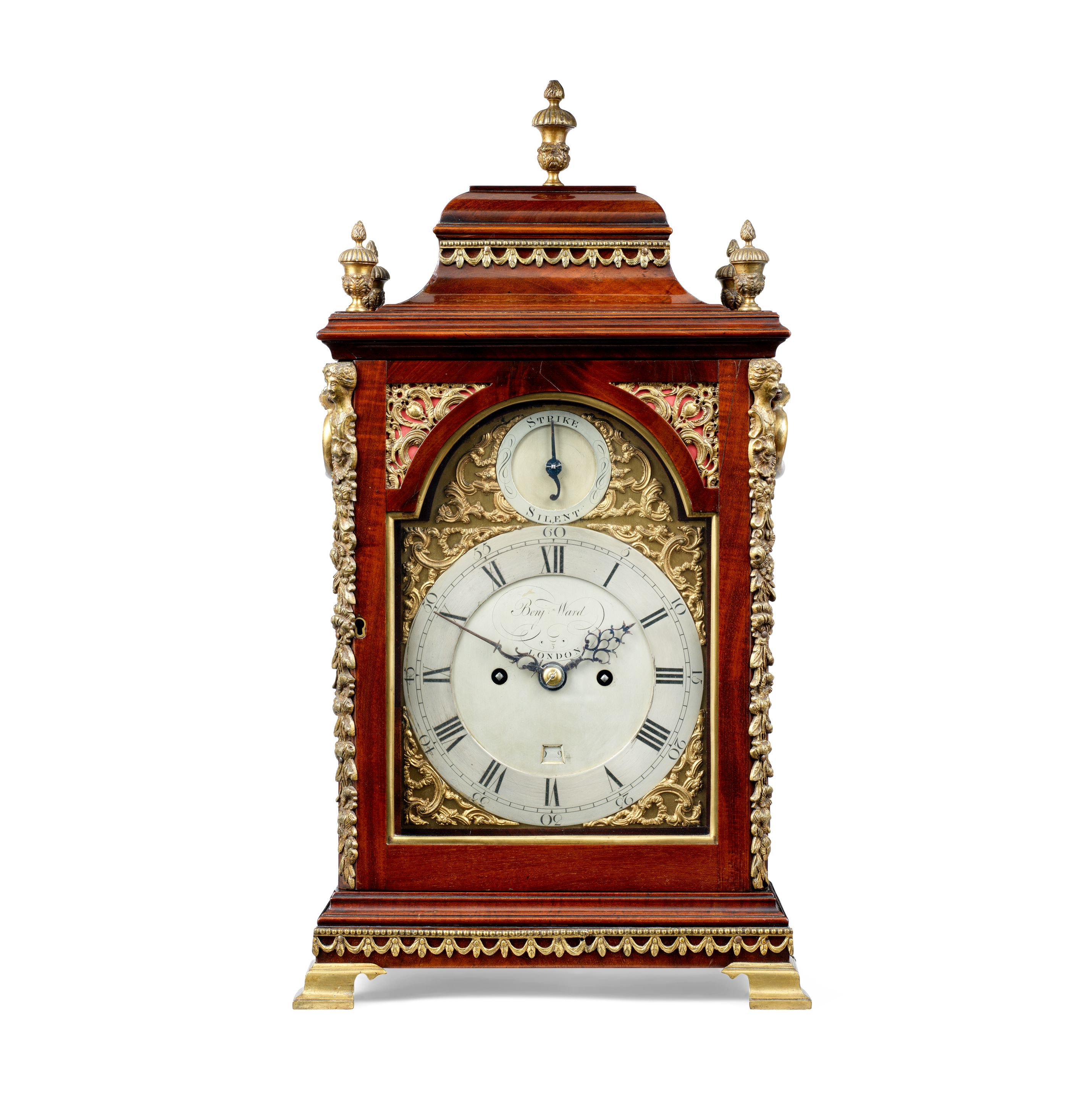 Of Royal Provenance: A third quarter of the 18th century mahogany bell topped bracket clock from the collection of Her late Royal Highness Princess Margaret, Countess of Snowdon. A gift on the occasion of her marriage to Charles Robert Armstrong-Jones, Earl of Snowdon on the 6 May 1960 by Mr and Mrs Parker Bowles, Donnington Castle House, Newbury, Berkshire. Benjamin Ward, London Dim 8 x 11,5 x20 Dim 8 x 11,5 x20 cm