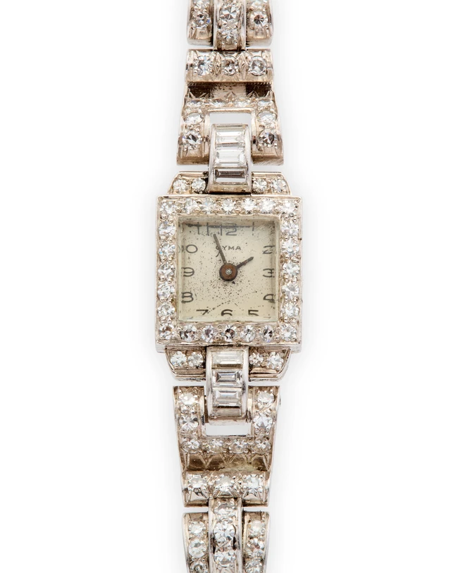 • Lot n° 621 Cyma. A platinum diamond set cocktail bracelet watch Case number 463387, Movement number...