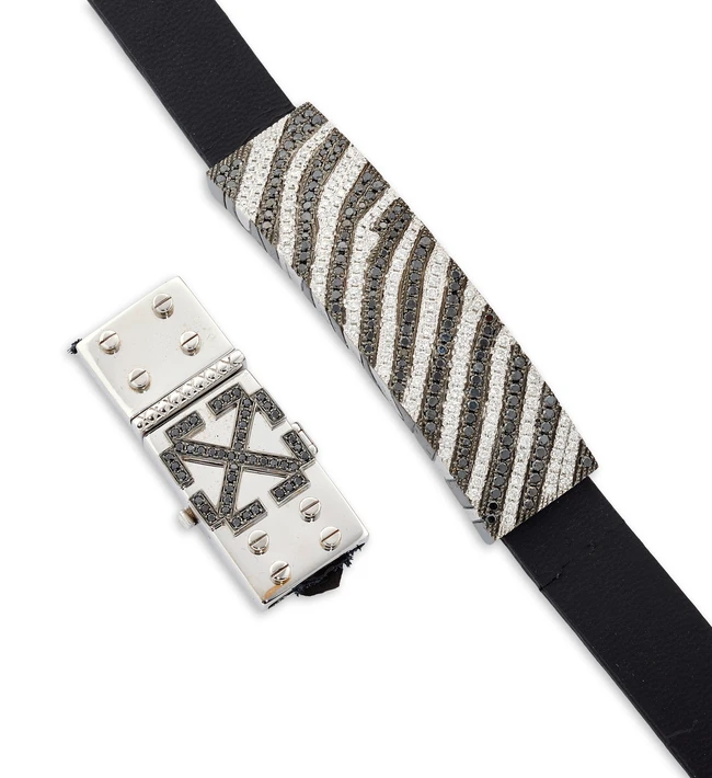 A coloured diamond set leather bracelet, composed of a central panel, with a zebra print design,...