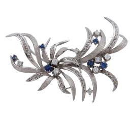 BROCHE EN ORO 18KT, ZAFIROS Y DIAMANTES Broche realizado en oro de 18kt. Diseño vegetal adornado por zafiros en talla redonda con peso total aprox 0.65ct y diamantes en talla brillante con un peso aprox 0.60ct Cierre: Aguja con mecanismo de seguridad Medidas: 7 x 4,5cm Peso: 17,60gr.