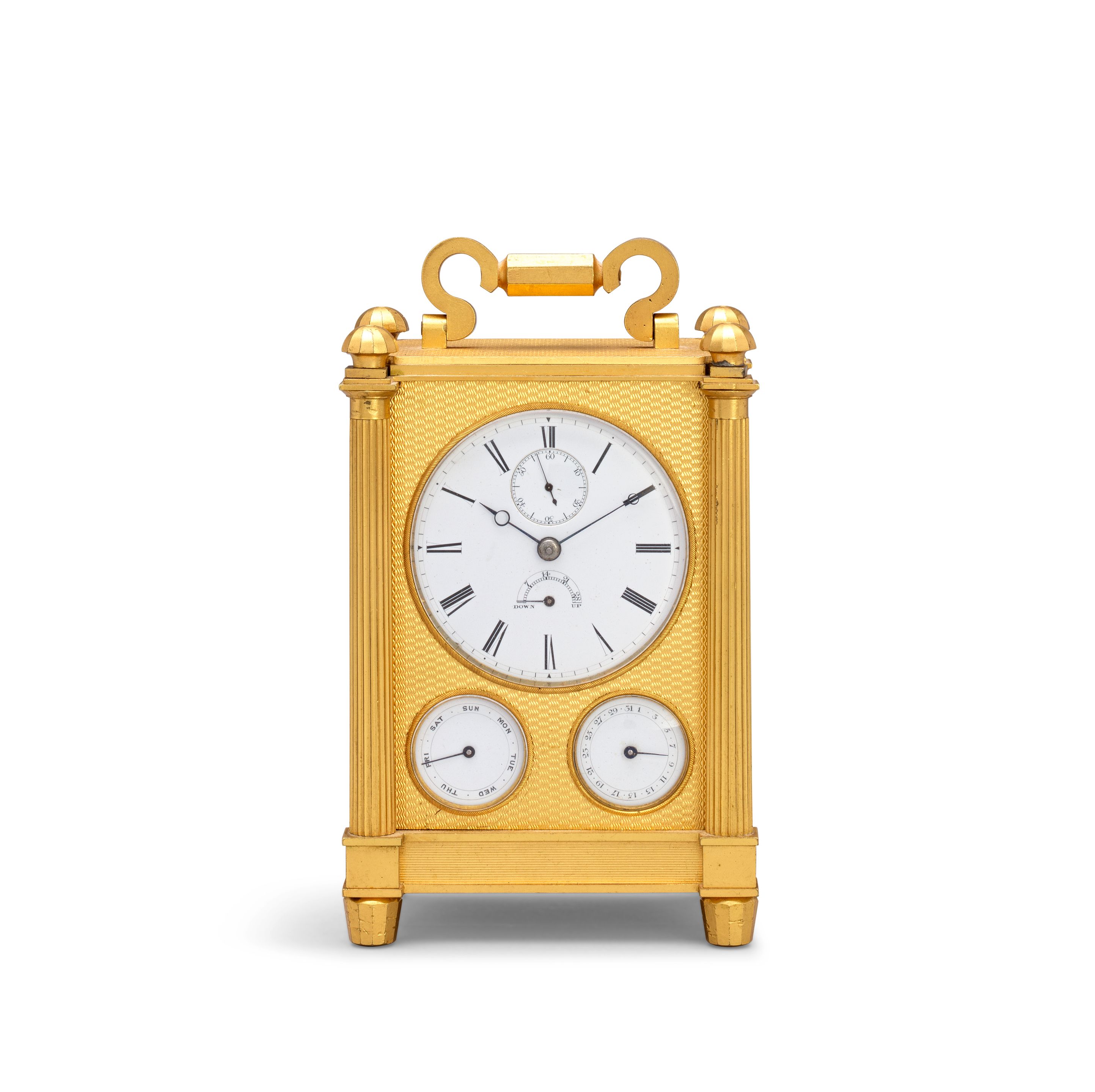 A fine mid 19th century English carriage timepiece with power reserve and calendar Dim 2,5 x 3,5 x5,5 Dim 2,5 x 3,5 x5,5 cm
