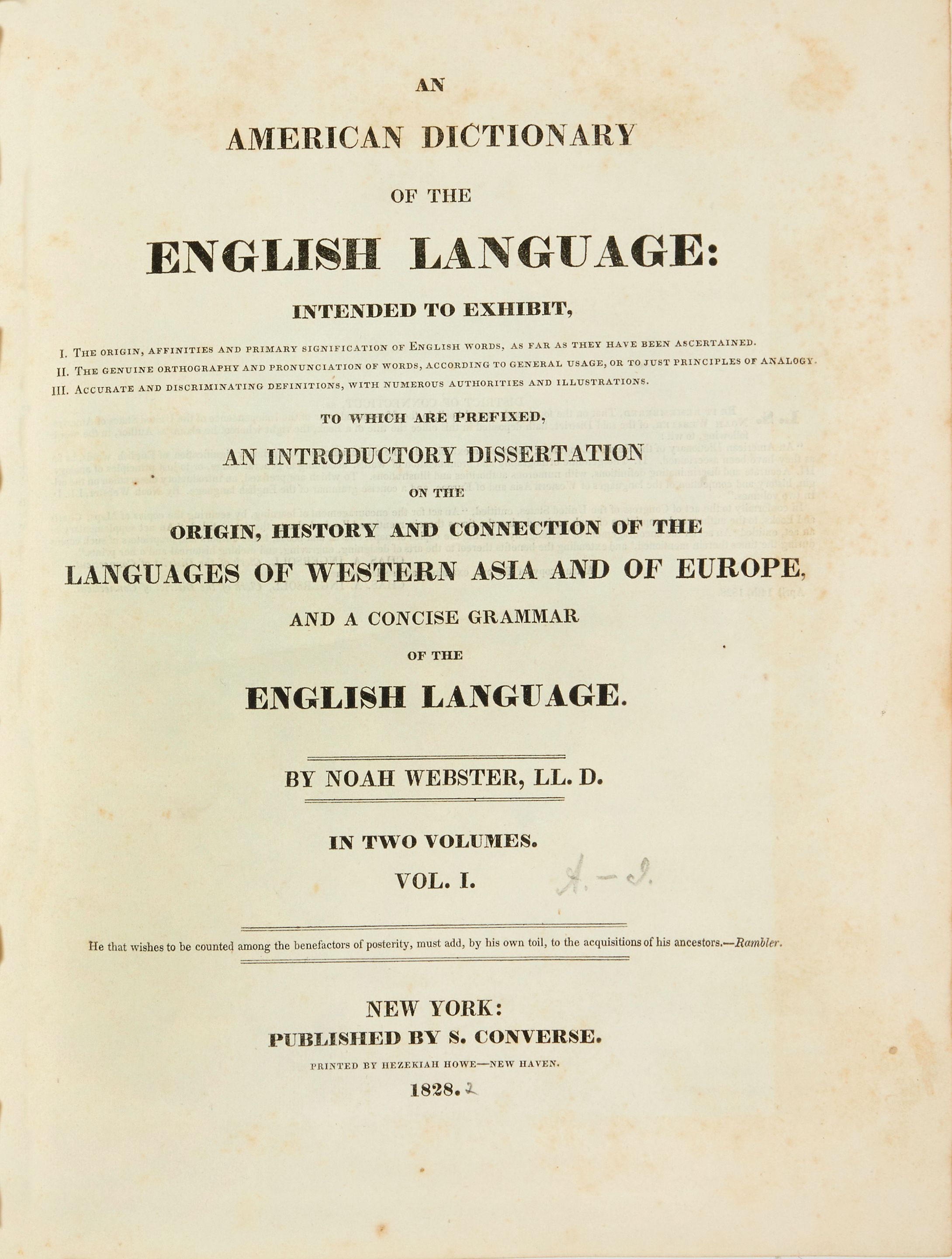 • Lot n° 131 WEBSTER (NOAH) An American Dictionary, 2 vol., FIRST EDITION, New York, Printed by Hezekiah Howe for S. Converse, 1828