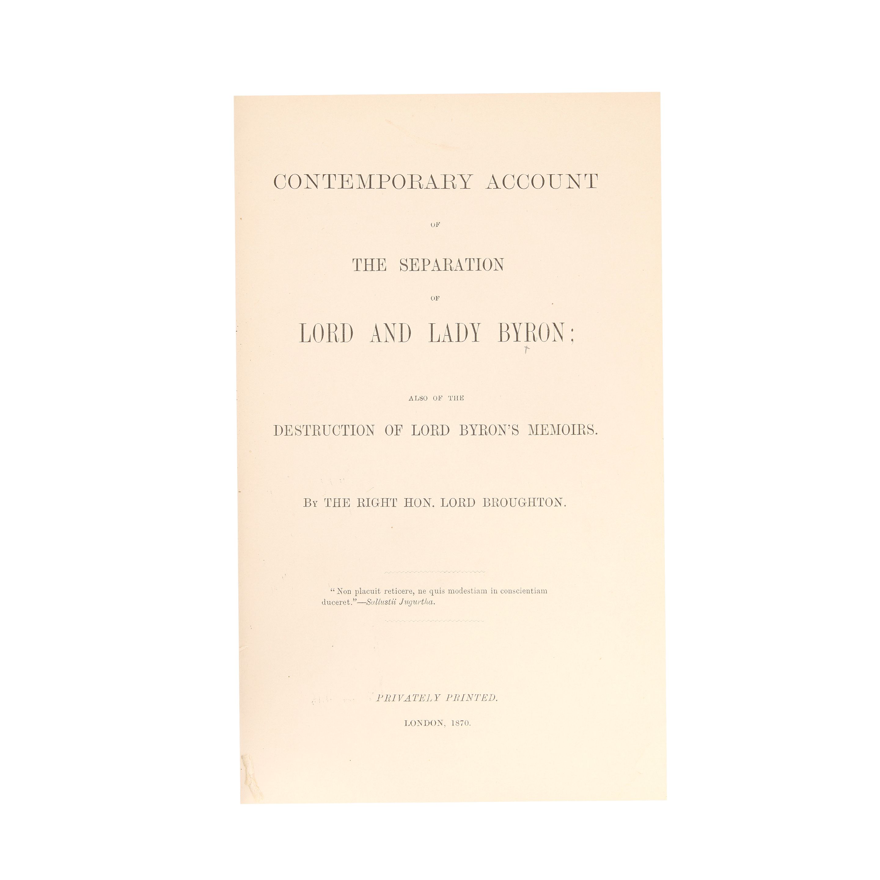 BYRONIANA HOBHOUSE (JOHN CAM, LORD BROUGHTON) Contemporary Account of the Separation of Lord and Lady Byron: Also of the Destruction of Lord Byron's Memoirs, FIRST EDITION, Privately Printed [by William Clowes], 1870