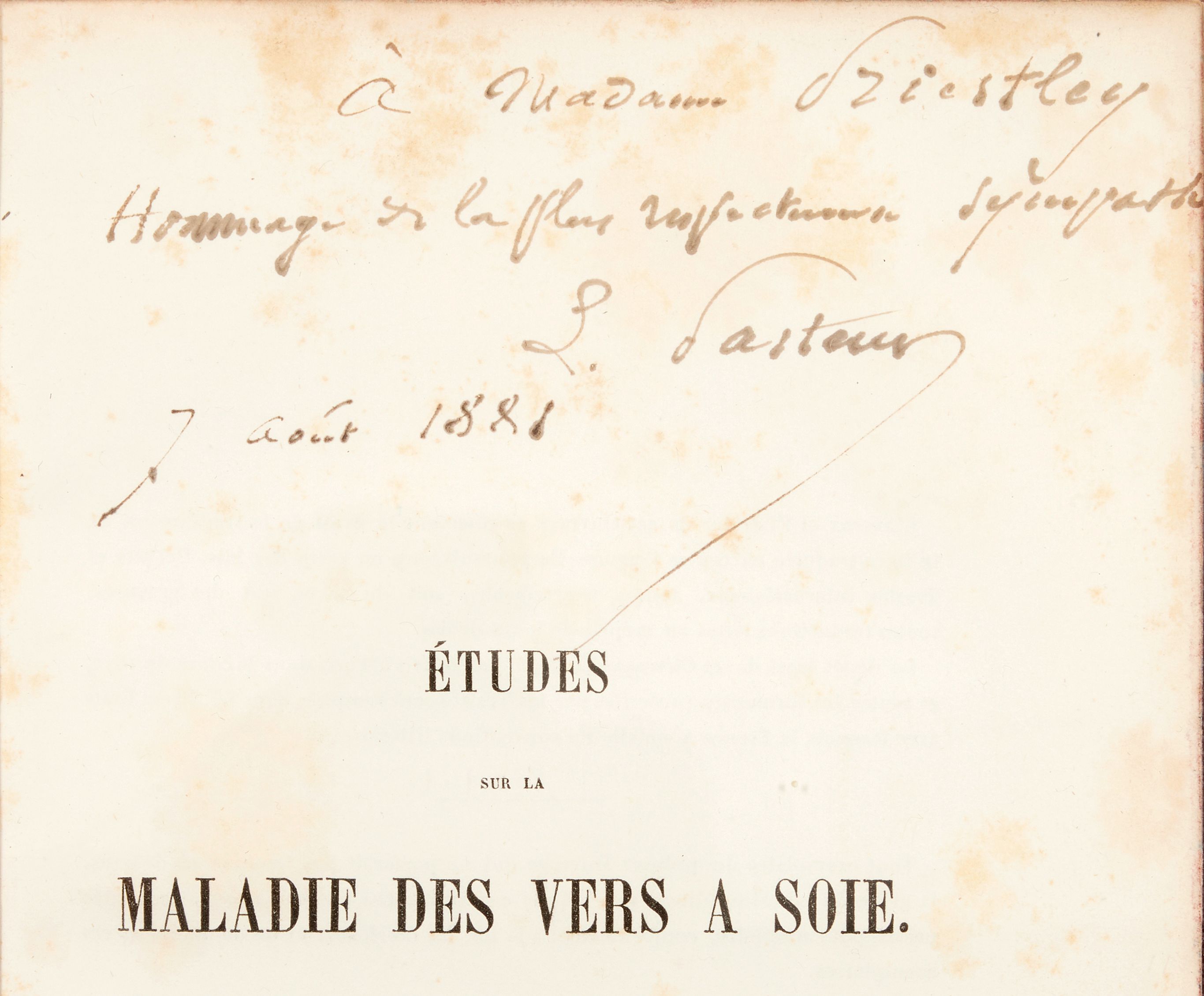 • Lot n° 77 PASTEUR (LOUIS) Études sur la Maladies vers a soie, 2 vol., FIRST EDITION, AUTHOR'S PRESENTATION COPY, WITH AN AUTOGRAPH LETTER SIGNED, 8vo