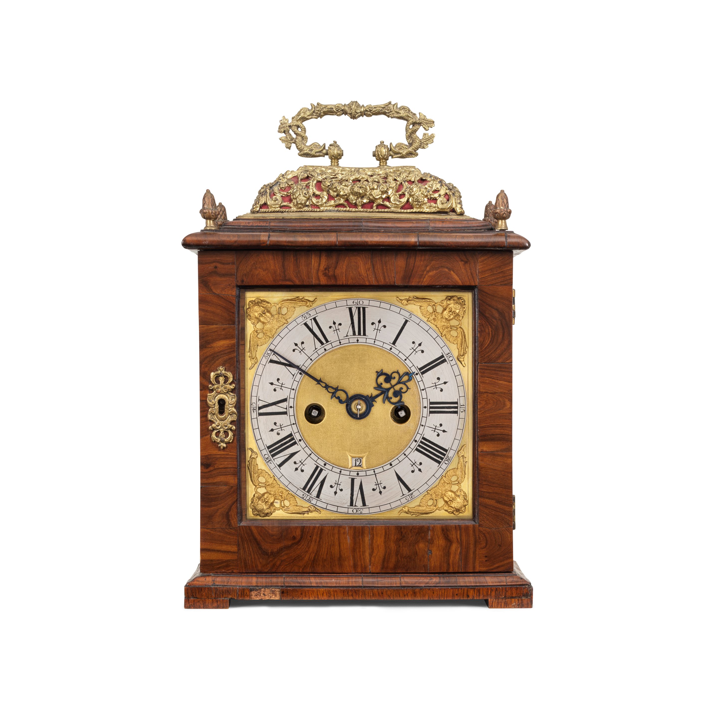 • Lot n° 74 A fine and rare late 17th century walnut veneered quarter repeating basket-top table clock of small size Jacob Hassenius, Whitehall London Dim 5,5 x 8,5 x14 Dim 5,5 x 8,5 x14 cm