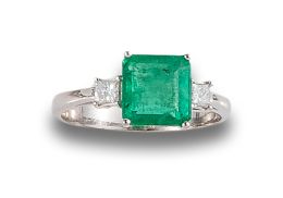 Sortija de oro blanco de 18 kt. Formada por una esmeralda en su talla, estimada en 1.50 ct. flanqueada por diamantes, talla princesa. Engaste en garras.