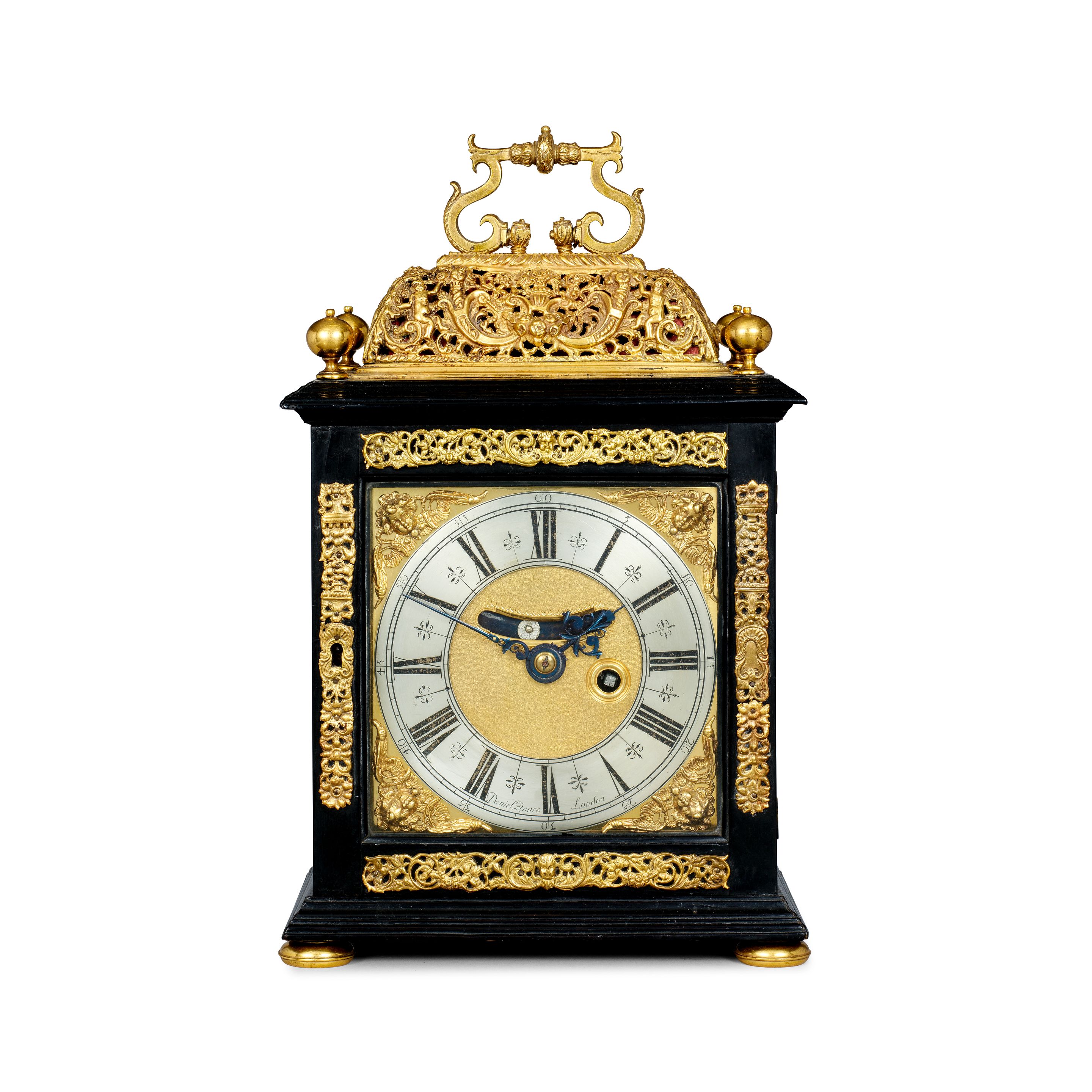 • Lot n° 51 A good late 17th century ebony veneered quarter repeating basket top table clock Daniel Quare, London Dim 7 x 10 x14,5 Dim 7 x 10 x14,5 cm