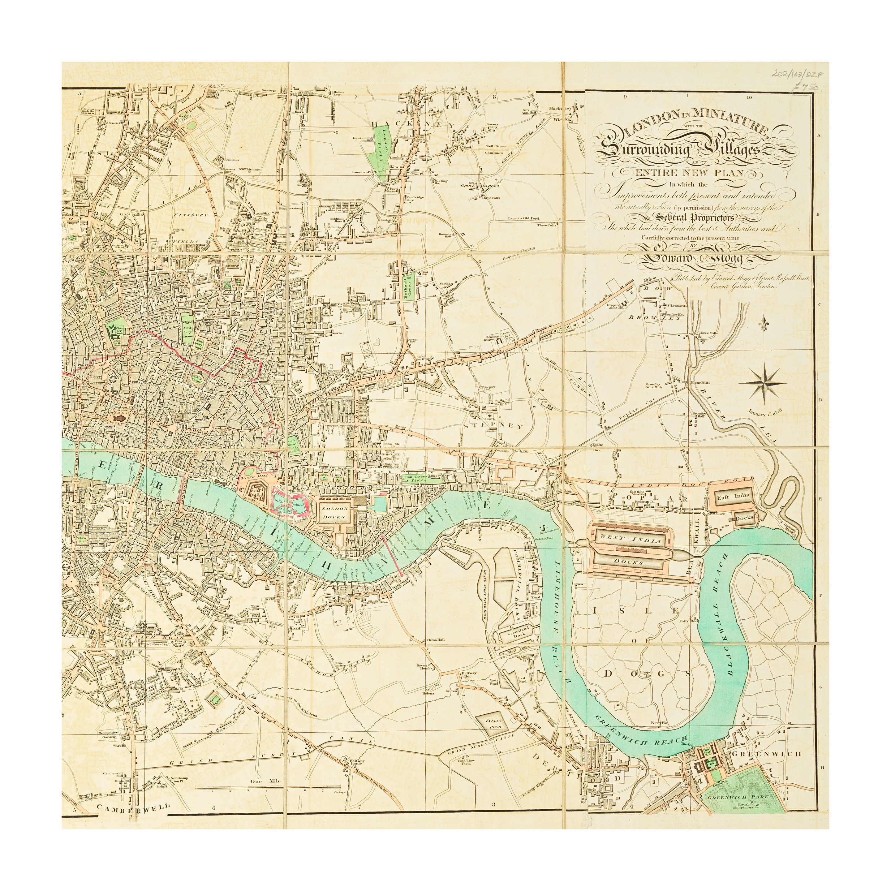 LONDON MOGG (EDWARD) London in Miniature with the Surrounding Villages. An Entire New Plan... Accompanied by... a Separate Index, Edward Mogg, 1842; Index to Mogg's New Plan..., 16pp., original plain wrappers, 8vo (2)