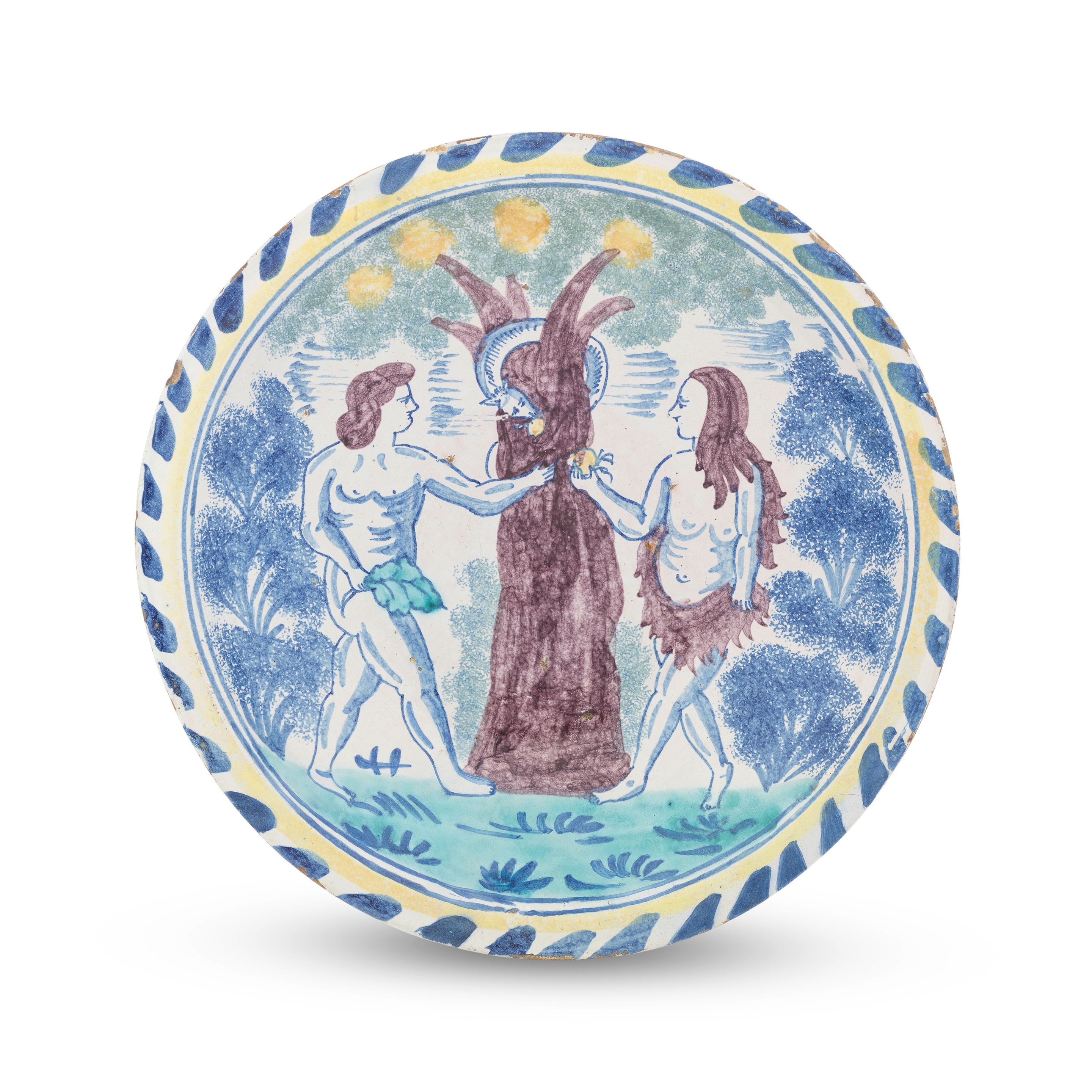 An English delftware Adam and Eve charger, early 18th century dimensions 33,8x33,8x6cm