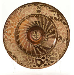 Plato de loza de Cataluña, ffs.S.XVI - pps.S.XVII De reflejo metálico con decoración vegetal en el alero, gallones macizos en el asiento y centro geométrico. Reverso con rueda central, círculos concéntricos y espirales achatadas y palmetas. Esmalte refrescado en algunas zonas y faltas. Diámetro: 42 cm