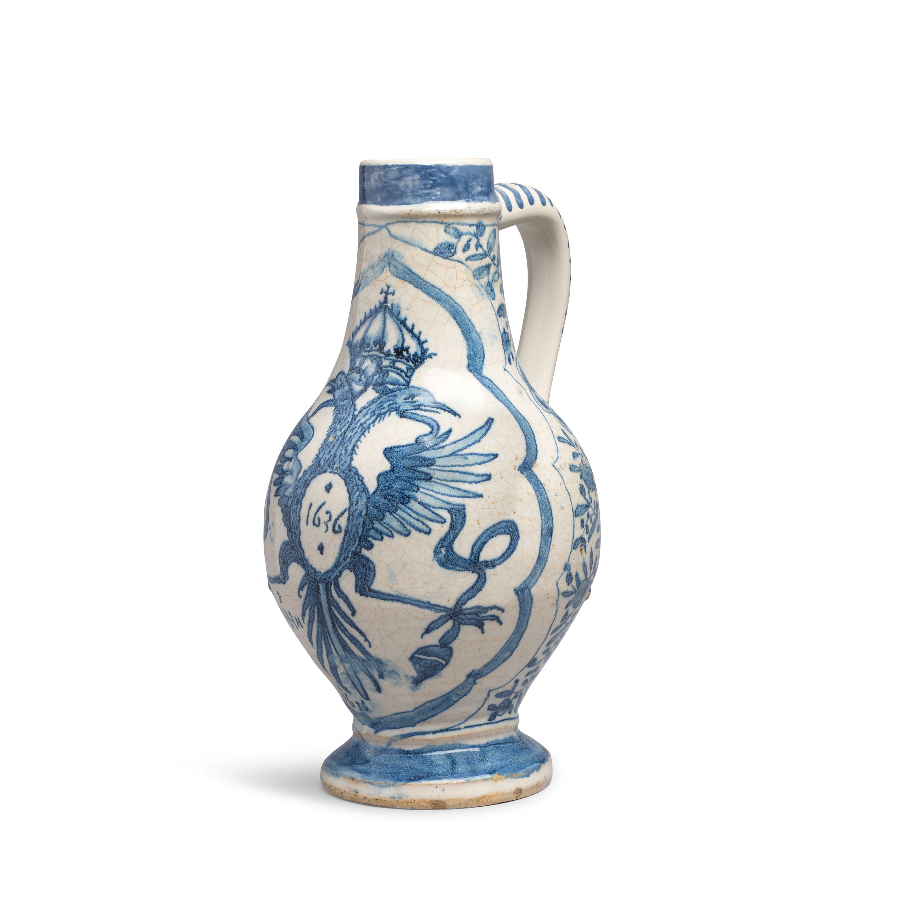 A Portuguese faience pear-shaped jug, dated 1636 Dim 26 cm