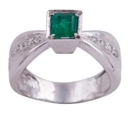 SORTIJA EN ORO 18KT, ESMERALDA Y DIAMANTES Sortija realizada en oro de 18kt. Esmeralda central en su talla cuadrada con peso aprox 0.60ct y en hombros diamantes en talla brillante con peso total aprox 0.08ct Medida Sortija: 11 Peso: 4,80gr.