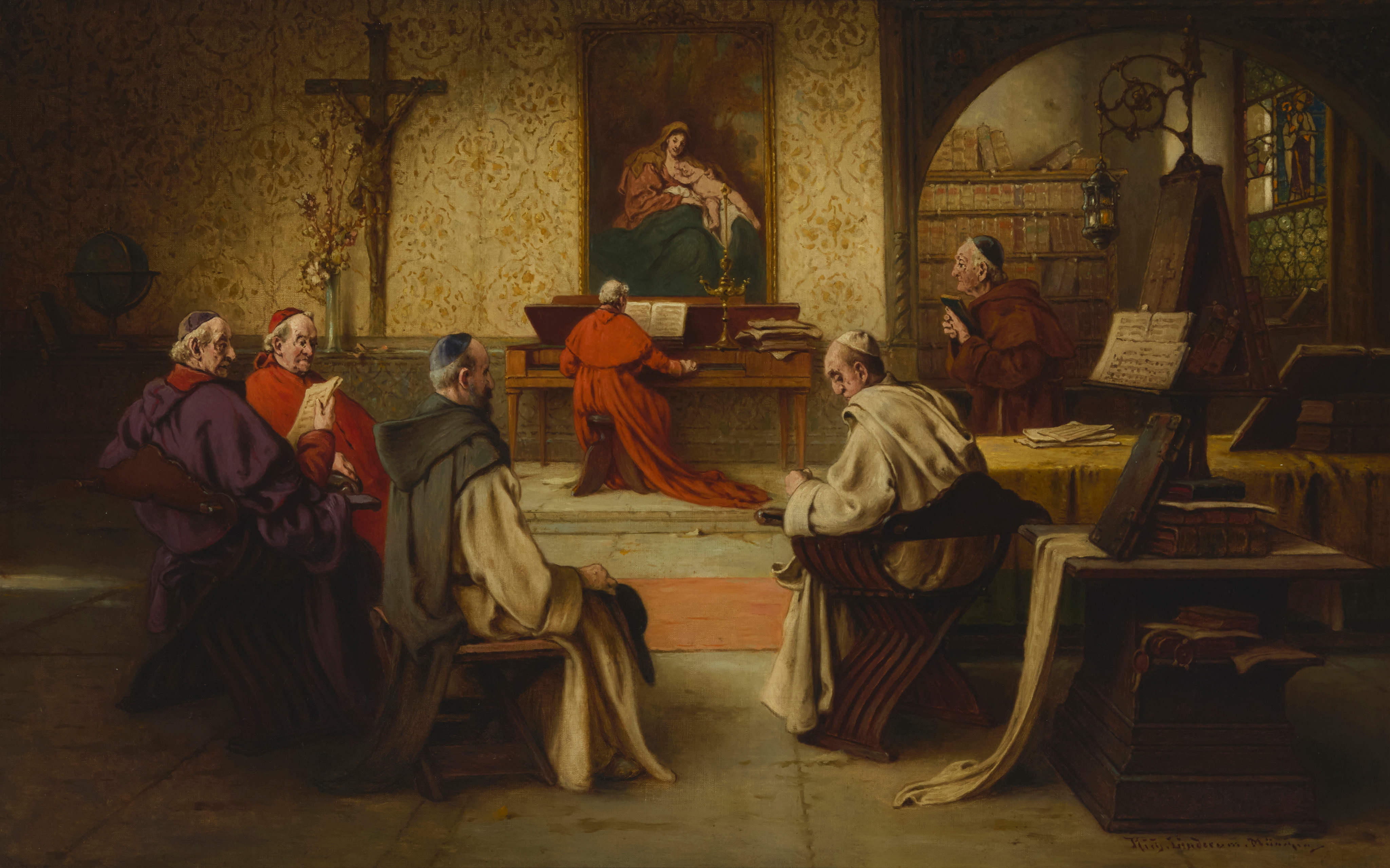 Richard Linderum (1851-1926) "Ave Maria" Oil on canvas Signed and inscribed lower right: Rich. Linderum. München; signed again (twice). and titled (twice). once on the stretcher. and once on a paper label affixed to the verso of the frame 28.25" H x 43.5" W Provenance: Collection of a German Noble House Sold: Christie's Amsterdam. "Art and Antiques from German Noble Houses...." March 24. 1999. Lot 557 Private Collection. Oregon. acquired from the above Sold: Freeman's | Hindman. "The International Sale." October 2. 2019. Lot 480 Private Estate. California Visual: Overall good appearance. Slight varnish discoloration and dust accumulation commensurate with age. Short areas of delicate frame abrasion in places along the lower. left. and right extreme edges. Blacklight: Occasional areas of touch-up in the robes of the two foreground figures at left. as well as in one of their beards. Touch-ups also in the face and robe of the figure standing in the background at right. A very narrow. 9" vertical band of touch-up at the extreme left edge. attendant with the frame abrasions already mentioned. Frame: 38" H x 52" W x 2.5" D