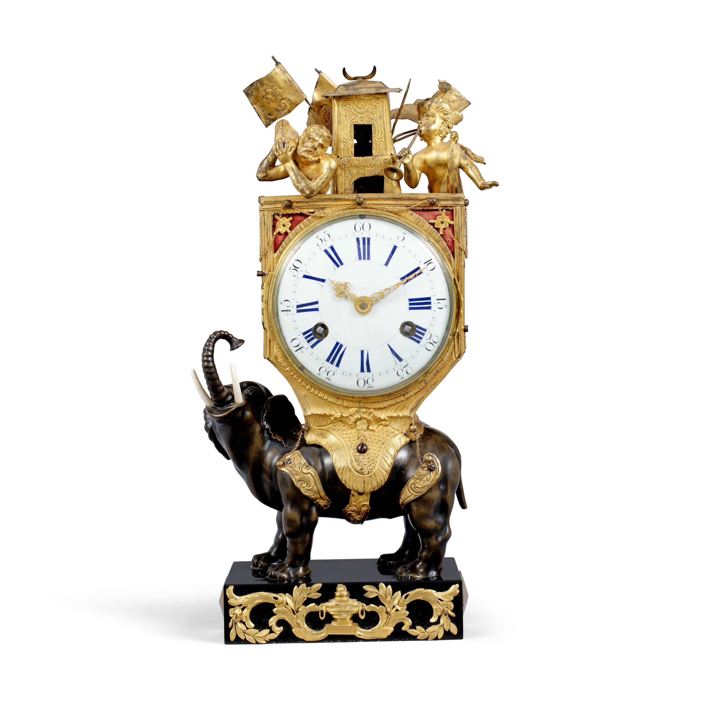 A fine mid 18th century patinated bronze and ormolu elephant clock with warriors Bailly Laine à Paris Dim 5 x 7,5 x18 Dim 5 x 7,5 x18 cm