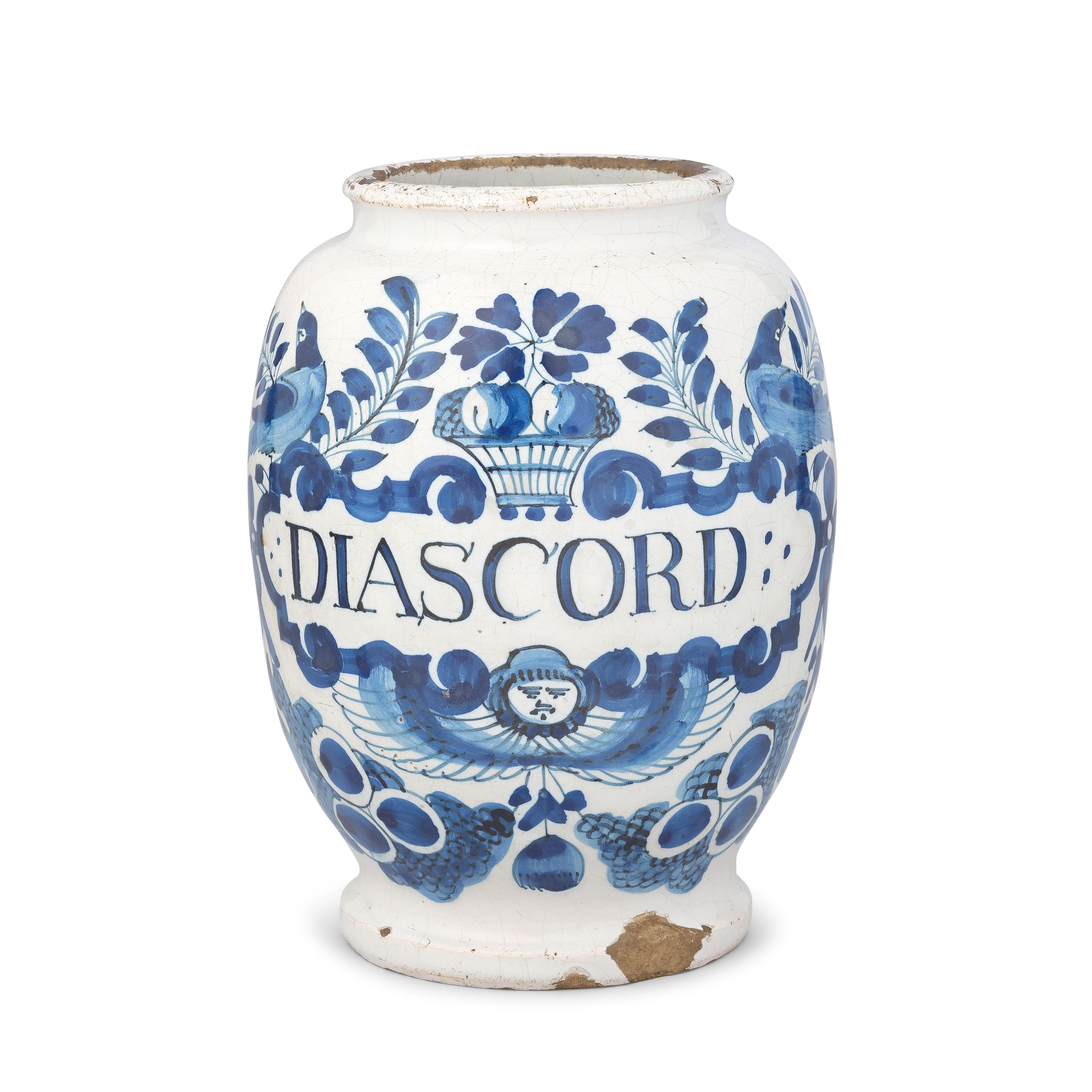 An English delftware drug jar, circa 1700-20 dimensions 13x13x19,5cm