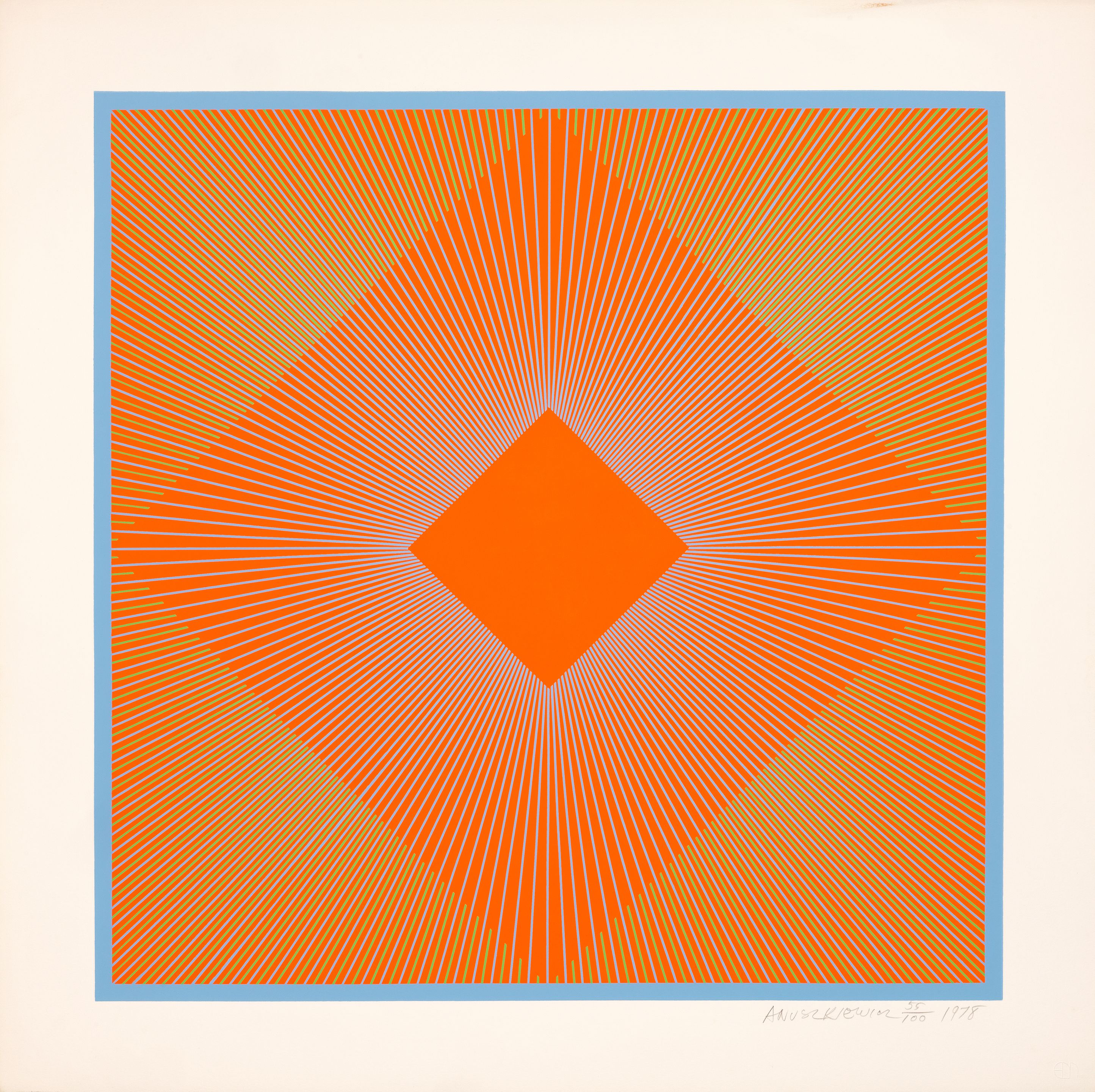 • Lot n° 122 Richard Anuszkiewicz (American, 1930-2020) Splendor of Orange Screenprint in colours, 1978, on wove paper, signed, dated and numbered 55/100 in pencil, with the artist's copyright and date stamped verso, printed by Editions Lassiter-Meisel, with their blindstamp, published by Abrams Original Editions, New York, the full sheet, unframedImage 695 x 695mm (27 3/8 x 27 3/8)Sheet 835 x 838mm (32 7/8 x 33in)