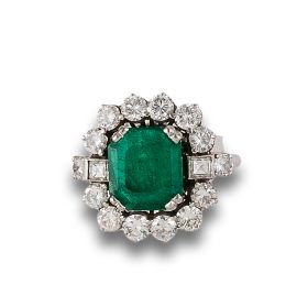 • Lot n° 1328 Sortija en platino, años 50, con esmeralda en su talla orlada por diamantes, talla brillante y carré.