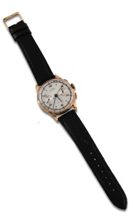 • Lot n° 1639 Reloj de pulsera DELBANA CHRONO, movimiento automático, caja en oro amarillo de 18 kt. Nº313 1750 1554. Guardapolvo en metal dorado. Diámetro: 37 mm. Esfera blanca con numeración arábiga y a trazos aplicados, ventanas auxiliares. Pulsera en piel no original.