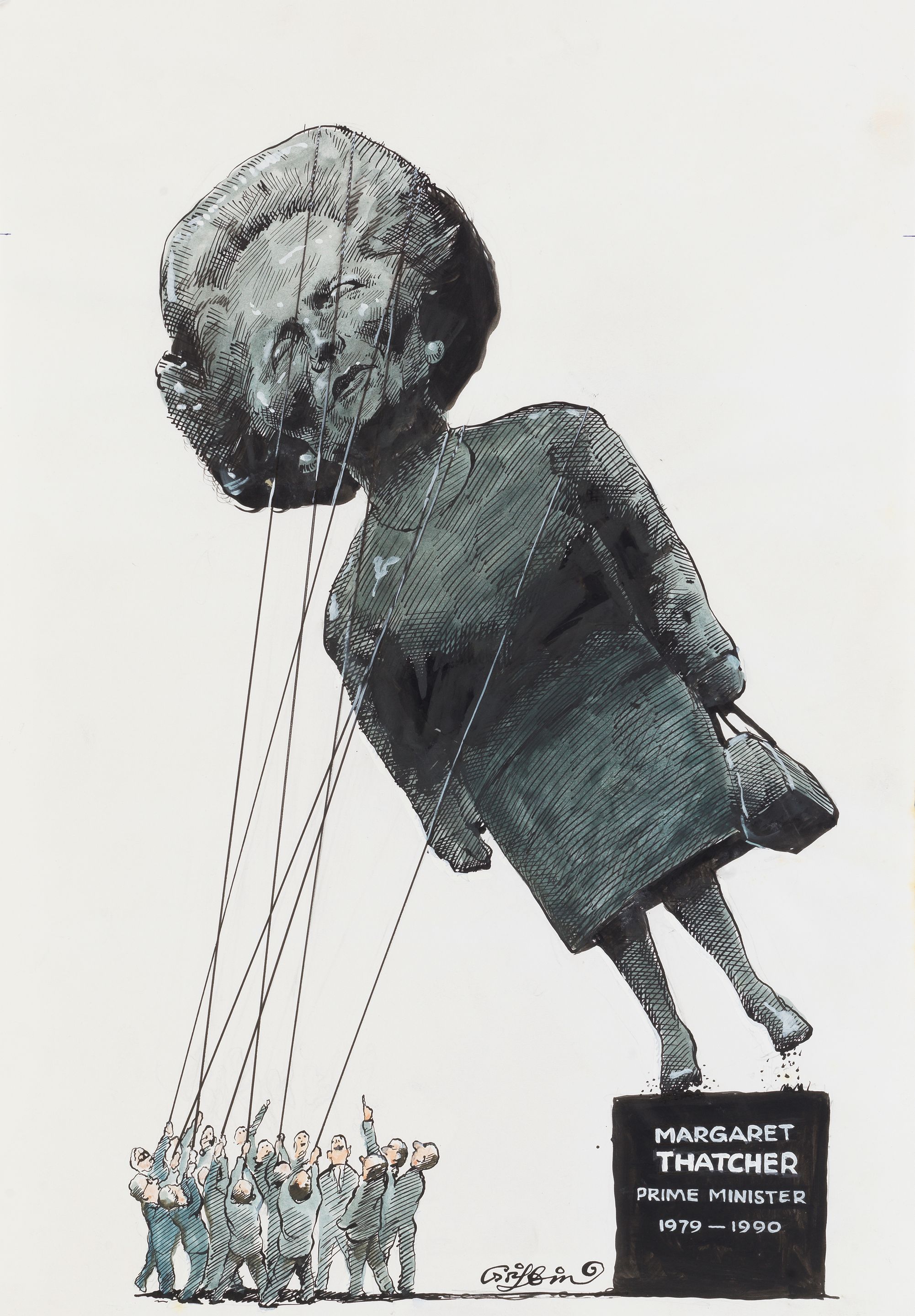 English School (20th Century) A selection of five cartoons of Margaret Thatcher To include: Richard Willson (British, 1939-2007), 'Dropping the Pilot', signed and titled (lower right), pen & ink, the image: 37x 18.5cm; Charles Griffin (British, born 1946), 'Mrs Thatcher Being Pulled Off a Pedestal', signed (lower centre), pen & ink and gouache, for the Daily Mirror, 52 x 35.5cm Bob Williams (British), 'Mrs Thatcher & Dennis at Breakfast', signed and dated '90 (lower left), pen & ink, wash and gouache, 32 x 29cm; and two others (5)